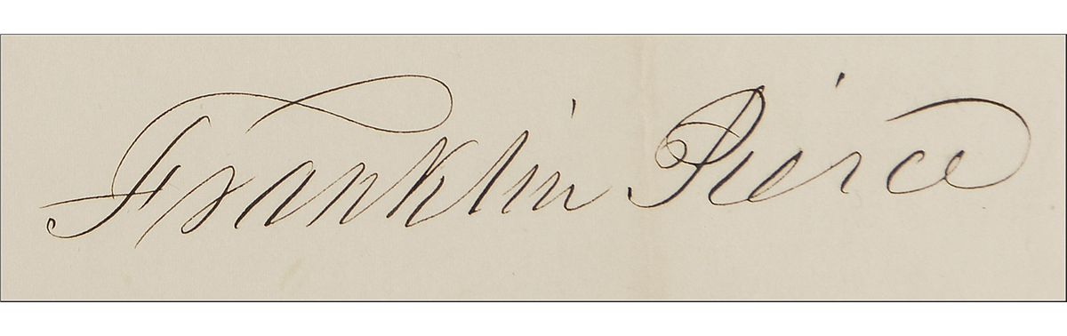 Partly-printed DS as president, one page, 21.5 x 17.75, August 15, 1853. A four-language ship’s papers issued to “Charles Tobey master or commander of the Ship called the Young Phenix…lying at present in the port of New Bedford bound for Pacific Ocean, and laden with Provisions, Stores, and Utensils for a whaling voyage.” Boldly signed by Pierce and countersigned by Secretary of State William L. Marcy. In very good condition, with partial separations along intersecting folds, one through a single letter of signature, with largest separation along old reinforcement to central vertical fold, scattered toning, including two round areas from seals, a tear to left edge, and some light creasing. The white wafer seal is toned and intact, with a second smaller notary seal near bottom. In its four-year voyage, the Young Phenix sent home over 47,000 pounds of whale bone and almost 3000 barrels of whale oil. Oversized.