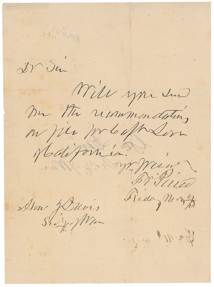 Scarce ALS as president signed “Fr. Pierce,” one page, 5 x 6.5, no date, but notated “Friday Morn,” by Pierce at the conclusion of the letter. Brief letter to his Secretary of War Jefferson Davis. In full: “Will you send me the recommendations on file for Capt. Love of California?” Pierce has also addressed the reverse of the letter to Davis, “Gen Davis, Secy of War.” In very good condition, with intersecting folds, a few trivial edge tears, scattered light toning, and pencil notation to reverse. Love was the head of California‘s first law enforcement agency, the California State Rangers, who earned the ire of many Californians for his exploits, most famously the capture of infamous bandit Joaquin Murrieta in July 1853. He was also involved in the Mexican War with a regiment of Alabama volunteers and quickly made a name for himself as a courier working along the Rio Grande River border. The here-offered letter is likely referencing Love’s military files from the Mexican War. Besides the incorporation of an interesting California personality, this is most importantly a great relation between Pierce and the future president of the Confederacy.