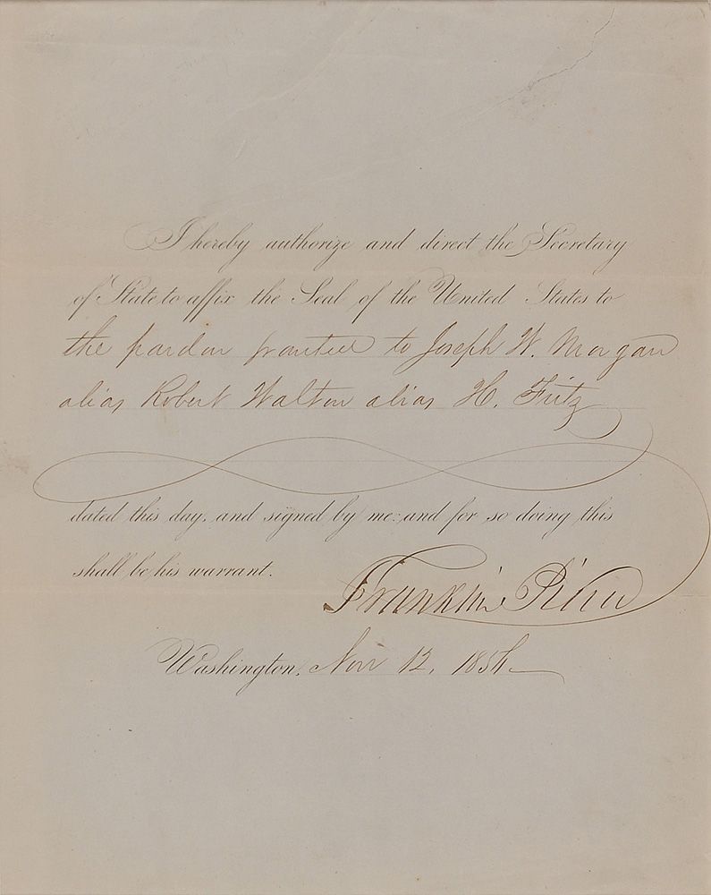 Partly-printed DS as president, one page, 7.75 x 9.75, November 12, 1854. Pierce orders the Secretary of State “to affix the Seal of the United States to the pardon granted to Joseph W. Morgan, alias Robert Walton, alias H. Fritz.”Matted to an overall size of 11 x 13. In very good condition, with horizontal fold through signature, scattered creases and toning, and a couple of repaired tears.