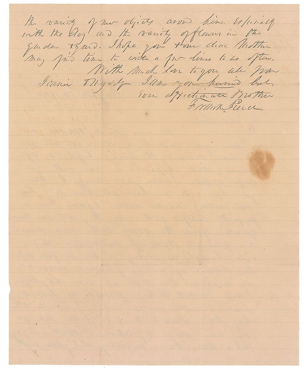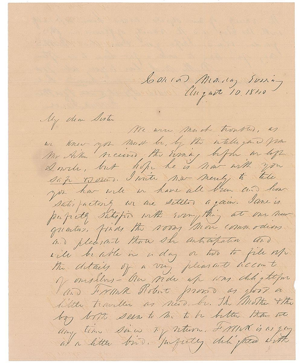 ALS, one page, lightly-lined both sides, 7.75 x 8.75, August 10, 1840. Letter to his sister. In part: “Jane is perfectly satisfied with everything at new quarters…Our ride up was delightful and Frank Robert is as good a little traveller as need be. The Mother & the boy seem to me to be better than at any time since my return. Frank is as gay as a little bird, perfectly delighted with the variety of new objects around him…I hope you & our dear Mother may find time to write.” Intersecting folds, one through a single letter of signature, a mild shade of overall toning, and a small spot of heavier toning to blank portion of reverse, otherwise fine condition. Accompanied by an unsigned engraving.