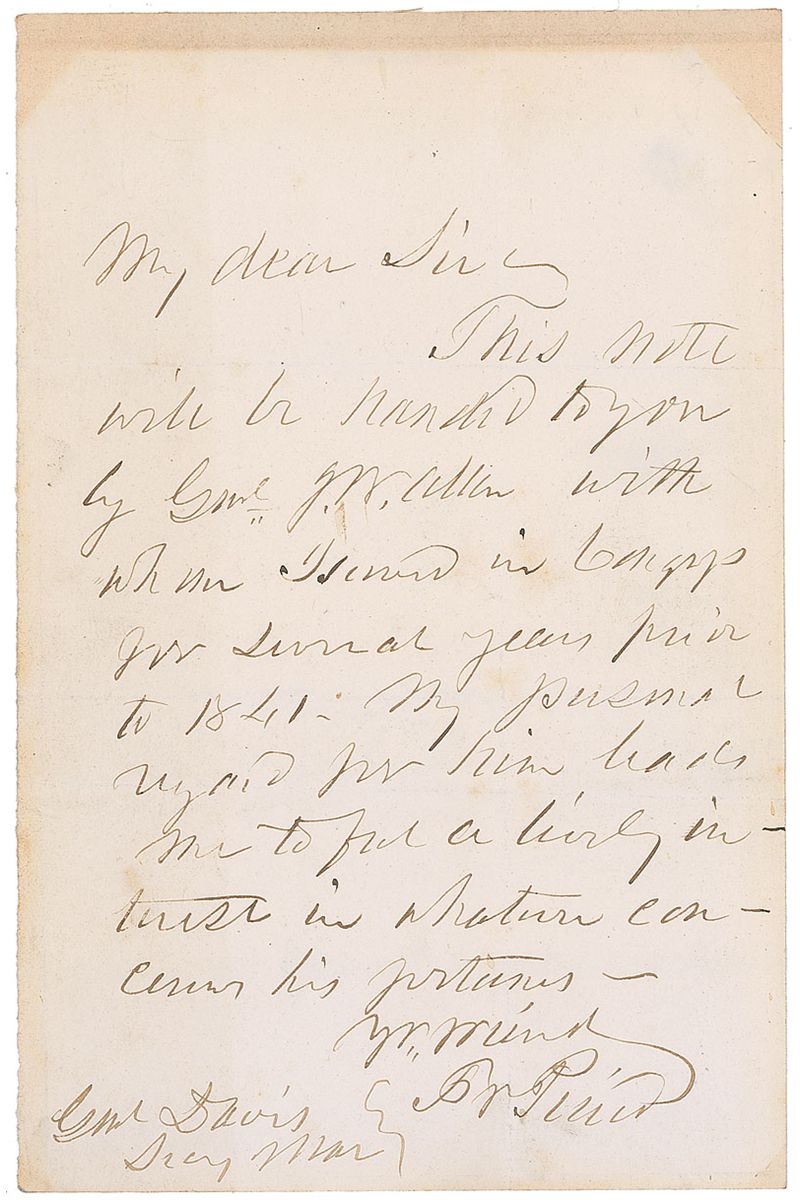 ALS signed as president, “Fr. Pierce,” one page, 5 x 7.5, no date. Letter to Secretary of War Jefferson Davis. In full: “This note will be handed to you by Genl. G.W. Cullum with whom I served in Congress for several years prior to 1841. My personal regard for him leads me to feel a lively interest in whatever concerns his fortunes.” Intersecting folds, one through a single letter of signature, toning along top edge and corners, and a mounting remnant to reverse top edge, otherwise fine condition.
