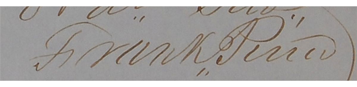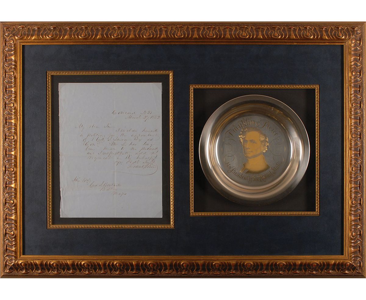 Uncommon ALS signed “Frank’n Pierce,” one page, 7.25 x 9.5, March 27, 1852. Letter to George Boutarte. In part: “I inclose herewith a petition for the appointment of Ebris S. Lawrence Esq. as Comsr. Mr. L. has long been known to me personally…I respectfully add my request in his behalf.” Attractively matted and framed with a gold-inlaid, sterling silver portrait plate issued in a limited edition by the Franklin Mint in the early-to-mid 1970s, to an overall size of 27 x 19. In fine condition, with intersecting folds and a few creases. Oversized.