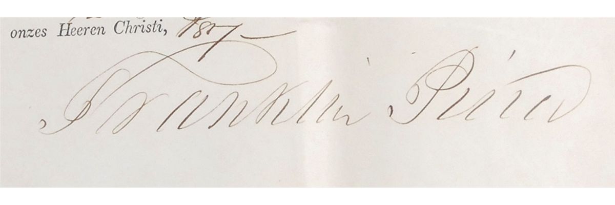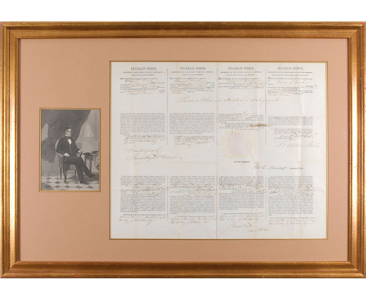Partly-printed DS as president, one page, 19.5 x 16, October 12, 1857. Four-language ship’s papers issued to “Henry J. Coop master or commander of the Ship called Maria Theresa…lying at present in the port of New Bedford bound for Pacific Ocean and laden with Provisions Stores and Utensils for a whaling voyage.” Signed in the fourth panel by Pierce and countersigned by Secretary of State William Marcy. Double-matted and framed with a portrait of Pierce to an overall size of 33.25 x 23.25. Intersecting storage folds, one through a single letter of signature, small repaired tear to top left, and a bit of scattered mild toning, otherwise fine condition. The seal is slightly toned, but crisp and intact. Sailing from the fall of 1857 until the spring of 1861, the Maria Theresa brought back over 12,000 pounds of whale bone. Oversized.