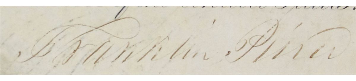 Partly-printed vellum DS as president, one page, 14.75 x 17.5, October 13, 1855. President Pierce appoints Joseph M. Bradford as “Lieutenant in the Navy from the 14th of September 1855 in the service of the United States.” Signed at the conclusion by Pierce and countersigned by Secretary of the Navy James C. Dobbin. Orange seal affixed to the bottom remains fully intact. Intersecting folds, mild overall foxing, and signatures a shade light, otherwise fine condition.