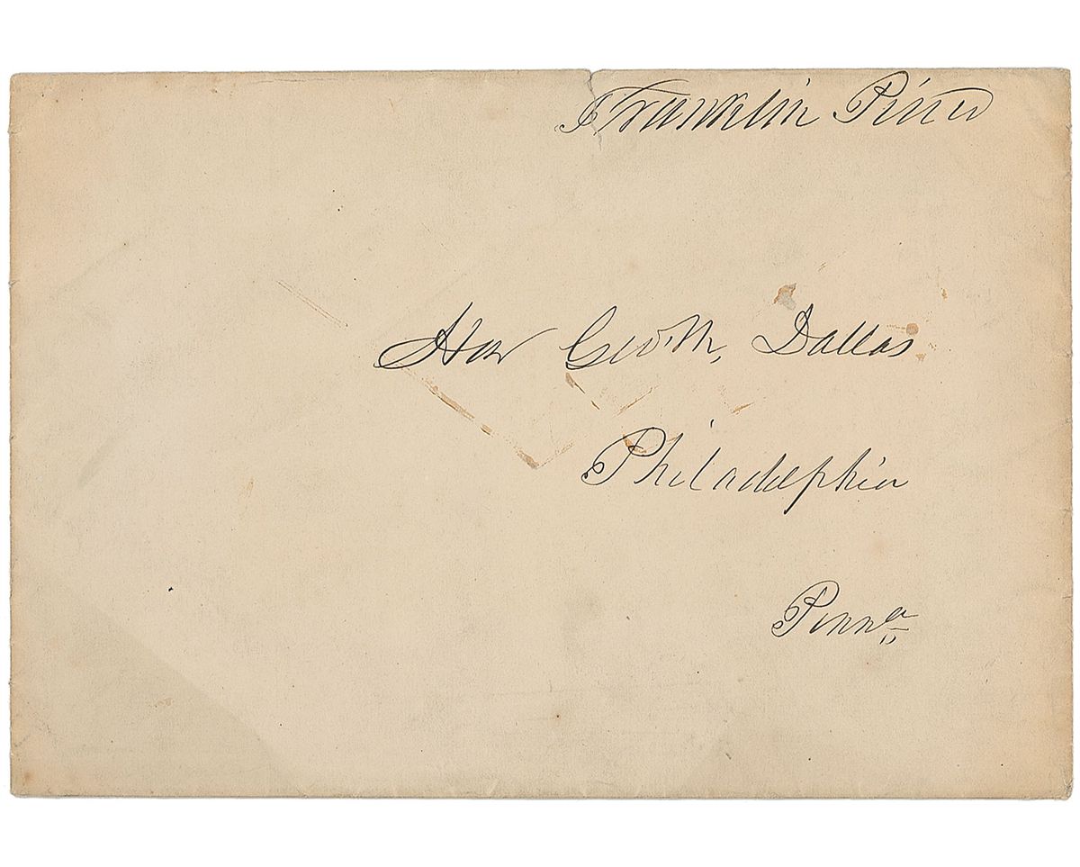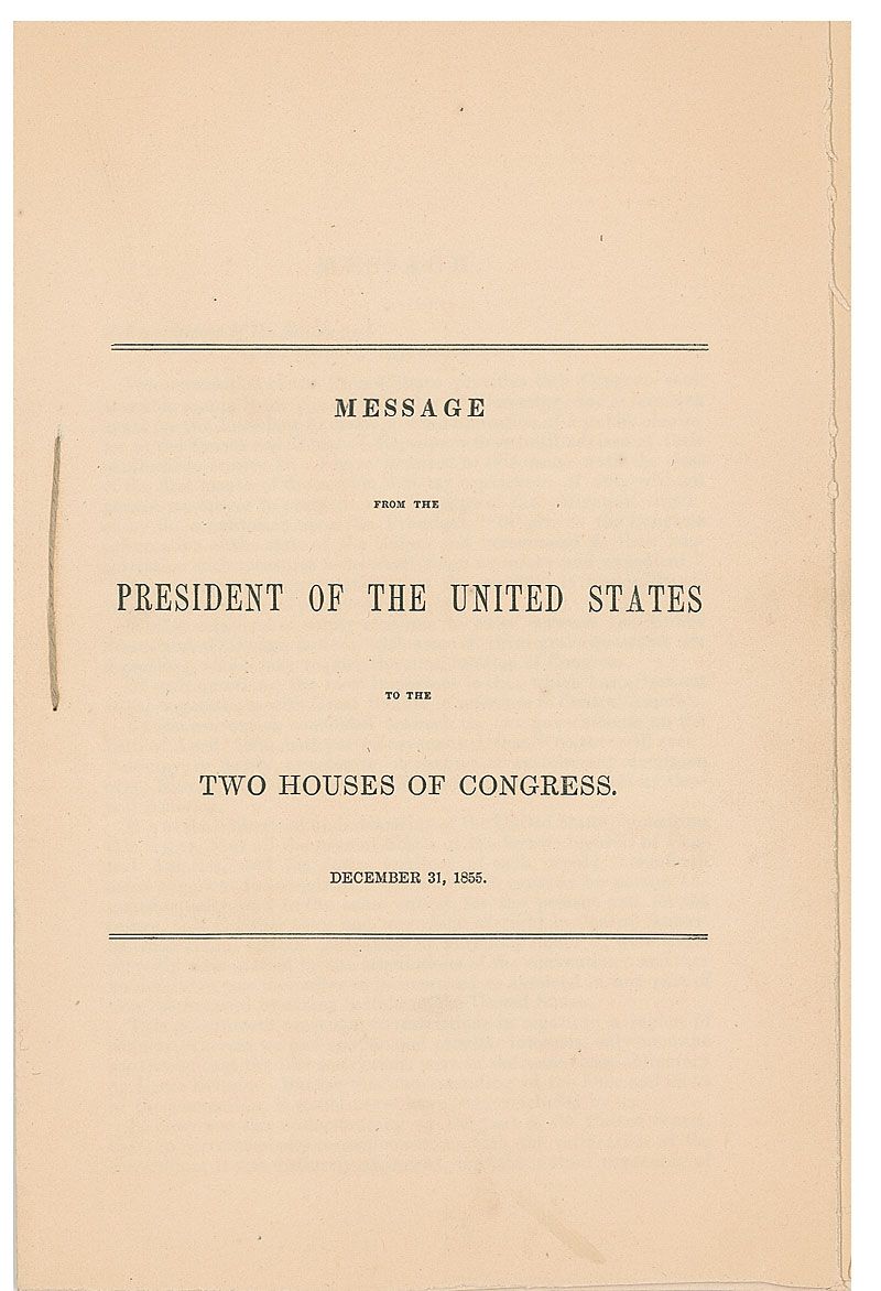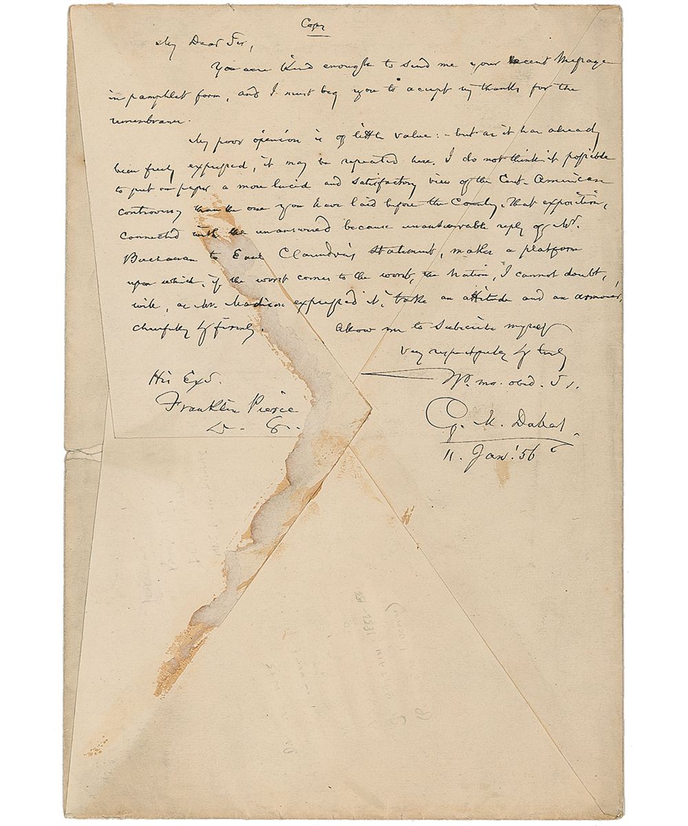 Hand-addressed and free franked envelope, 9.75 x 6.5, addressed by Pierce to “Hon. Geo. M. Dallas, Philadelphia, Penna,” and franked in the upper right, “Franklin Pierce.” This envelope carried a printed copy of Pierce’s 1855 State of the Union Address, sent to Dallas, which is included. Reverse of the envelope bears a retained copy of a letter to Franklin Pierce in the hand of George M. Dallas (Polk’s Vice President), complimenting the President’s message. Letter reads: “You are kind enough to send me your recent Message in pamphlet form, and I must beg you to accept my thanks for the remembrance. My poor opinion is of little value: but as it has already been freely expressed, it may be repeated here. I do not think it possible to put on paper a more lucid and satisfactory view of the Cent American controversy than the one you have laid before the country. That exposition, connected with the unanswered became unanswerable reply of Mr. Buchanan to Earl Clarendon’s statement, makes a platform upon which, if the worst comes to the worst, the Nation, I cannot doubt, will, as Mr. Madison expressed it, ‘take an attitude and an armor’ cheerfully & firmly.” Some scattered light toning and soiling to envelope, a small tear to top edge through first letter of signature, and adhesive and paper remnants over portions of Dallas’s letter, otherwise fine condition. Once a political ally of Pierce’s, Dallas eventually became an opponent, even attempting to gain the Democratic nomination for president in 1855. Pierce commenced a campaign to keep Dallas from running, offering his the ambassadorship to London, which he eventually accepted. The move turned out to be of little use to Pierce, as he was defeated by James Buchanan in the 1856 Democratic Convention.