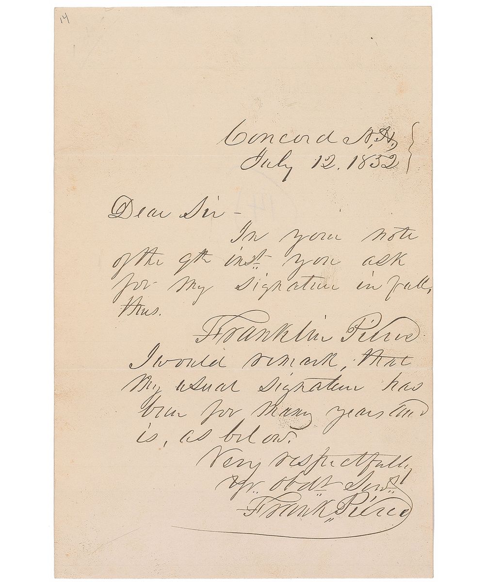 ALS signed “Frank’ Pierce,” one page, 5 x 7.5, July 12, 1852. Letter to an unidentified gentleman. In full: “In your note of the 9th inst you ask for my signature in full, thus Franklin Pierce. I would remark, that my usual signature has been for many years and is, as below.” In fine condition, with a bit of scattered light foxing.