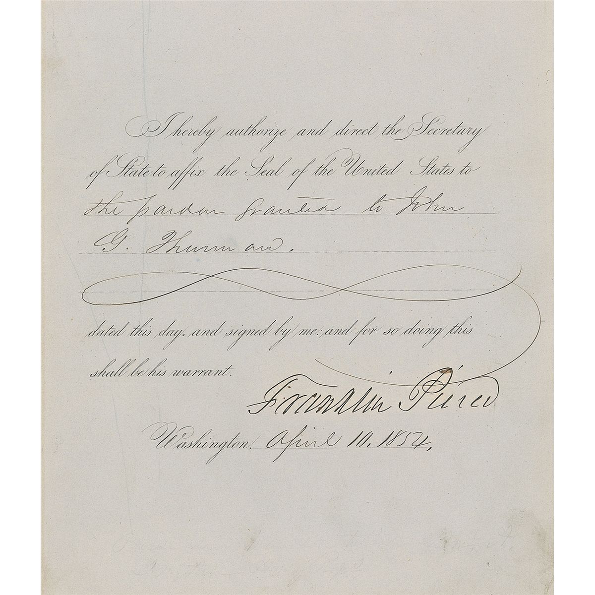 Partly-printed DS as president, one page, 7.75 x 9, April 10, 1854. President Pierce directs the secretary of state to “affix the Seal of the United States to the pardon granted to John G. Thurman.” Affixed to a slightly larger cardstock sheet. In fine condition, with expected document wear. A boldly signed presidential document.