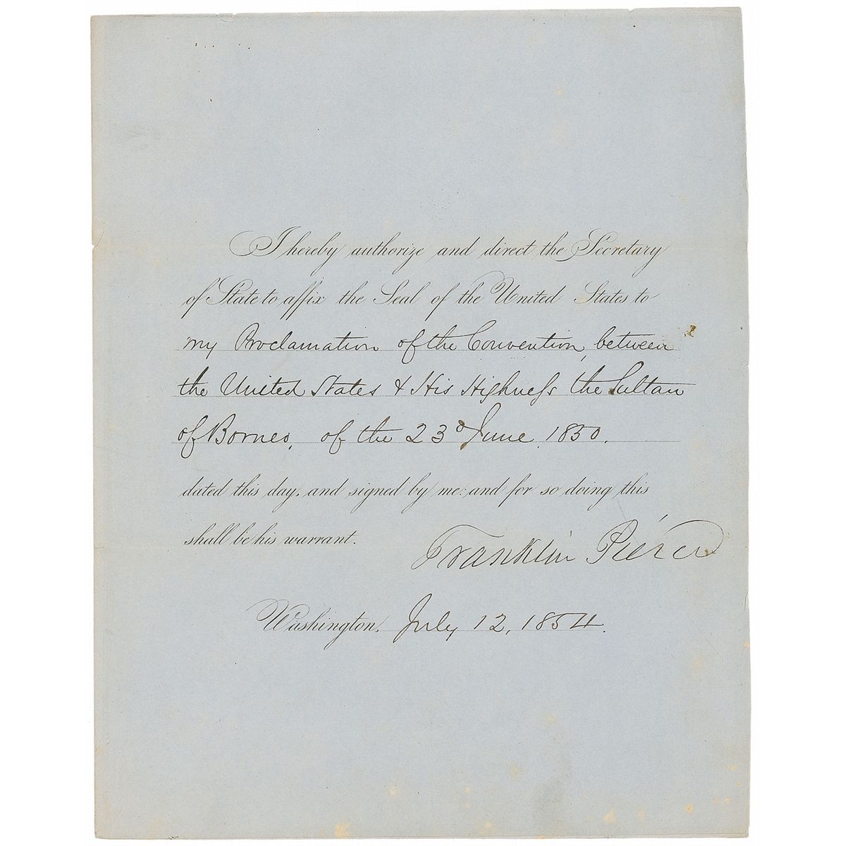 Partly-printed DS as president, one page, 8.25 x 10.25, July 12, 1854. President Pierce directs the secretary of state “to affix the Seal of the United States to my Proclamation of the Convention, between the United States & His Highness the Sultan of Borneo, of the 23d June 1830.” In fine condition, with some mild spotting and light edge dings. The US and Borneo signed a treaty on June 23, 1830, which set forth terms for trade between the nations, exempting imports and exports from duties; in the agreement, the sultan also agreed to aid any American ships wrecked off the coast of Borneo. An intriguing early trade agreement between the United States and the exotic Southeast Asian island nation.
