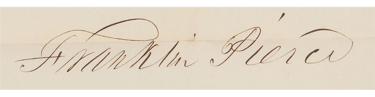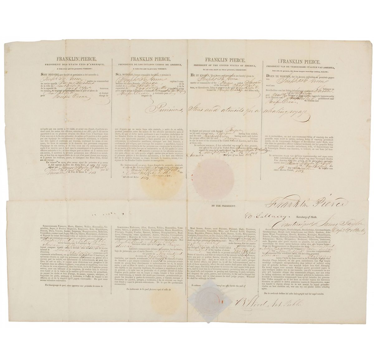 Partly-printed DS as president, one page, 21.25 x 16.75, November 16, 1853. Four-language ship’s papers issued to “Joseph K. Green master or commander of the Barque called Susan…lying at present in the port of New Bedford bound for Pacific Ocean and laden with Provisions, Stores and utensils for a whaling voyage.” Boldly signed in the fourth panel by Pierce and countersigned by Secretary of State William Marcy. The crisp presidential seal affixed to the center remains fully intact, as does the notary seal affixed at the bottom. Fragile intersecting storage folds (vertical and horizontal folds passing through signature), a few small splits at intersections (including one at signature), and areas of toning from seals, otherwise fine condition. Captain Green commanded the Susan out of New Bedford on two lengthy voyages. The first commenced the day after he was issued this document, on November 17, 1853, and returned in late June of 1856, bringing with it 1,154 barrels of sperm whale oil and 137 barrels of whale oil. Its ill-fated final voyage began on November 10, 1856, but it was lost off the coast of Ecuador on June 20, 1857; 250 barrels of sperm oil were able to be salvaged. Four-language ships papers for whaling voyages are considered scarce and important maritime documents, and represent an unusual part of America’s history at sea.