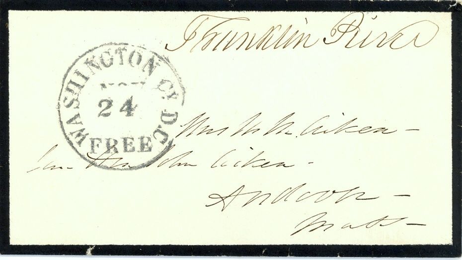 14th President of the United States. Nice Free Frank signature on a mourning bordered envelope by Pierce. Date stamp Nov. 24th form Washington D.C. Fine Condition
