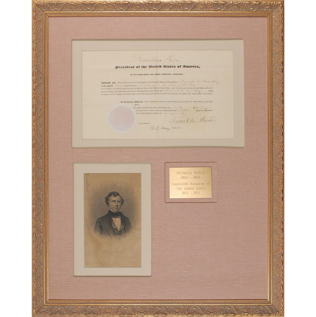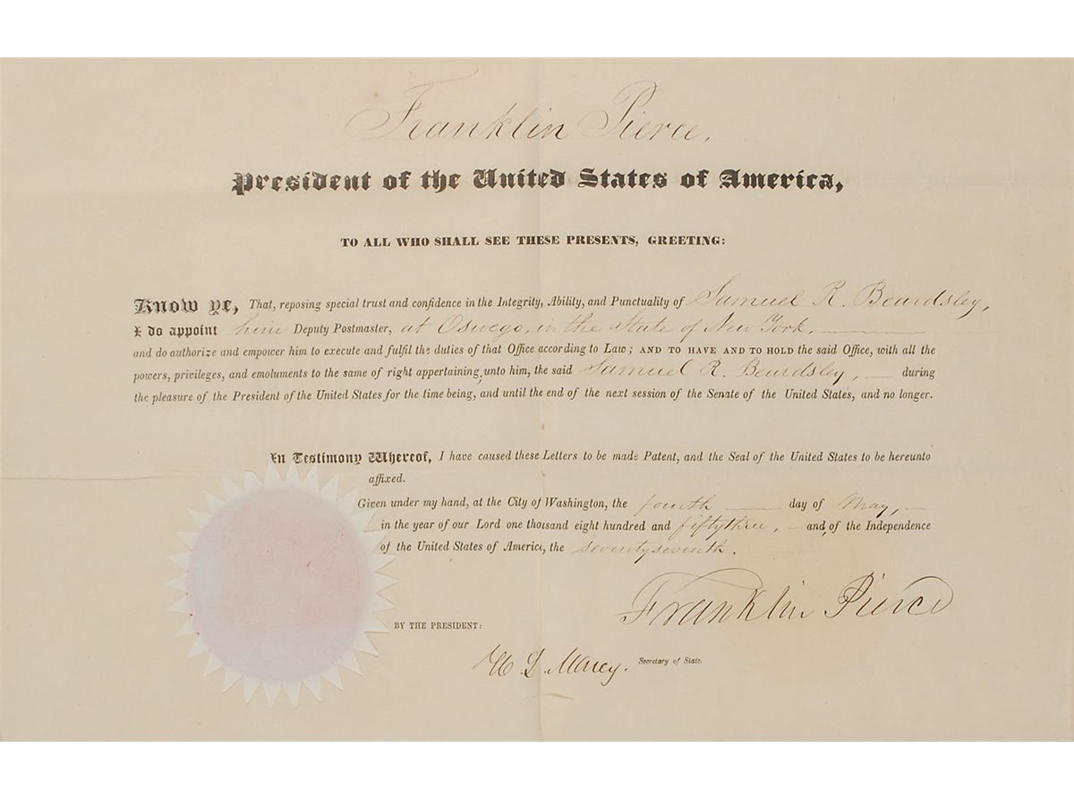 Partly-printed DS as president, one page, 14.25 x 8.5, May 4, 1853. President Pierce appoints Samuel R. Beardsley as “Deputy Postmaster, at Oswego, in the State of New York.” Prominently signed at the conclusion by Franklin Pierce and countersigned by Secretary of State William L. Marcy. The crisply embossed white paper seal affixed to the lower left remains fully intact. Handsomely double-cloth-matted and framed with a contemporary engraved portrait of Pierce and engraved nameplate to an overall size of 24.5 x 30.5. In fine condition, with intersecting folds, a small tear below Marcy’s signature, and a mild circular area of toning from the seal. Oversized.