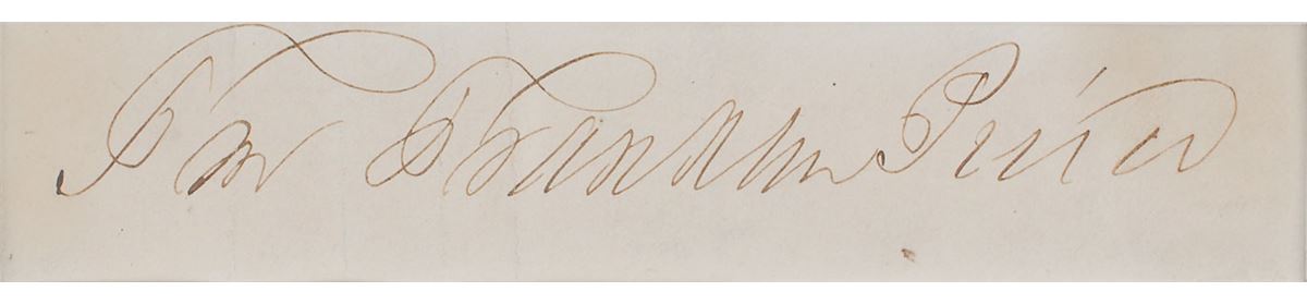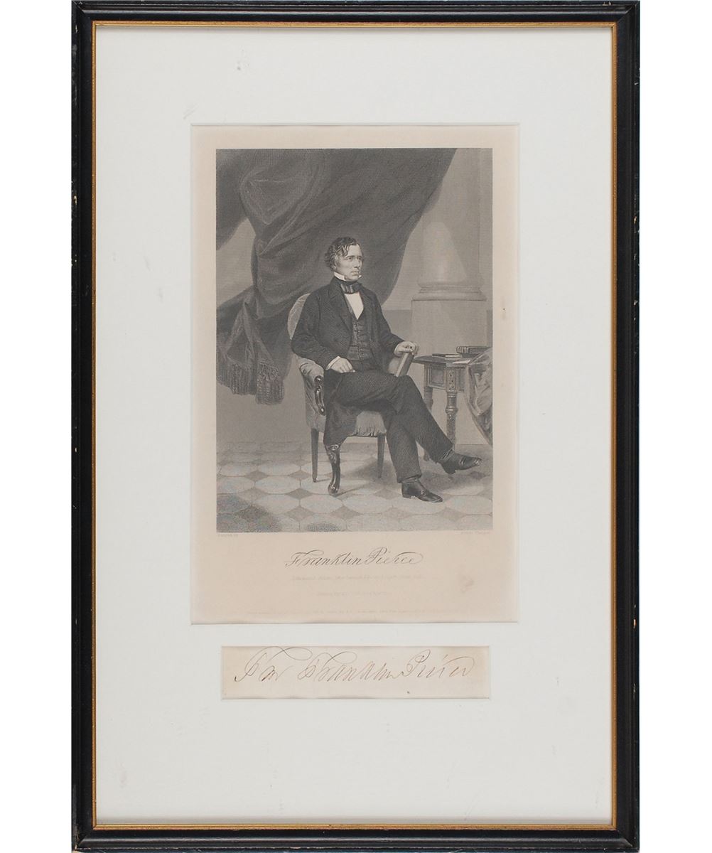 Crisp franking signature, “Free Franklin Pierce,” on an off-white 5.25 x 1 slip clipped from a larger address panel. Matted and framed with an engraved portrait of Pierce bearing a facsimile signature to an overall size of 11.25 x 16.75. Vertical folds passing through initial portions of the signature, light soiling, and a closely cropped top edge, otherwise fine condition.