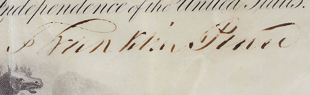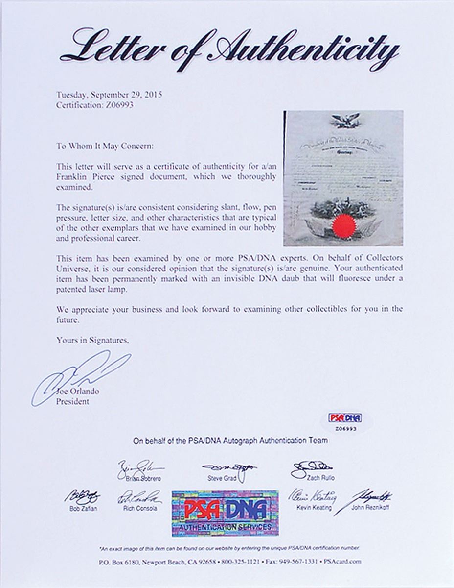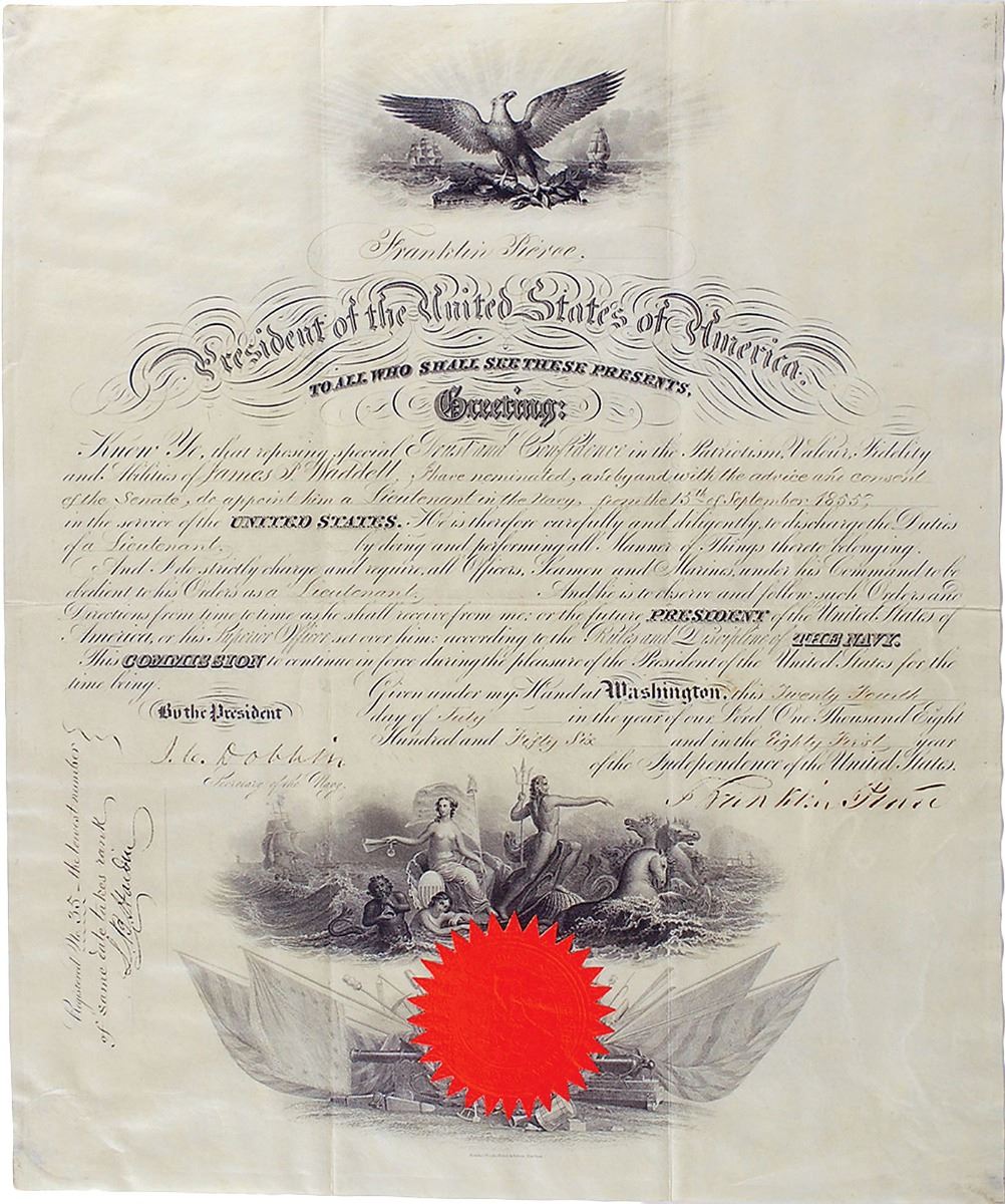 Partly-printed vellum DS as president, one page, 14.75 x 18, July 24, 1856. President Pierce appoints James P. Waddell as “a Lieutenant in the Navy.” Signed at the conclusion by Pierce and countersigned by Secretary of the Navy James C. Dobbin. The crisp orange seal affixed at the bottom remains fully intact. Intersecting folds, some light dampstaining to the right side somewhat affecting the signature area, and a bit of irregular ink adhesion to signature, otherwise fine condition. Accompanied by a full letter of authenticity from PSA/DNA.
