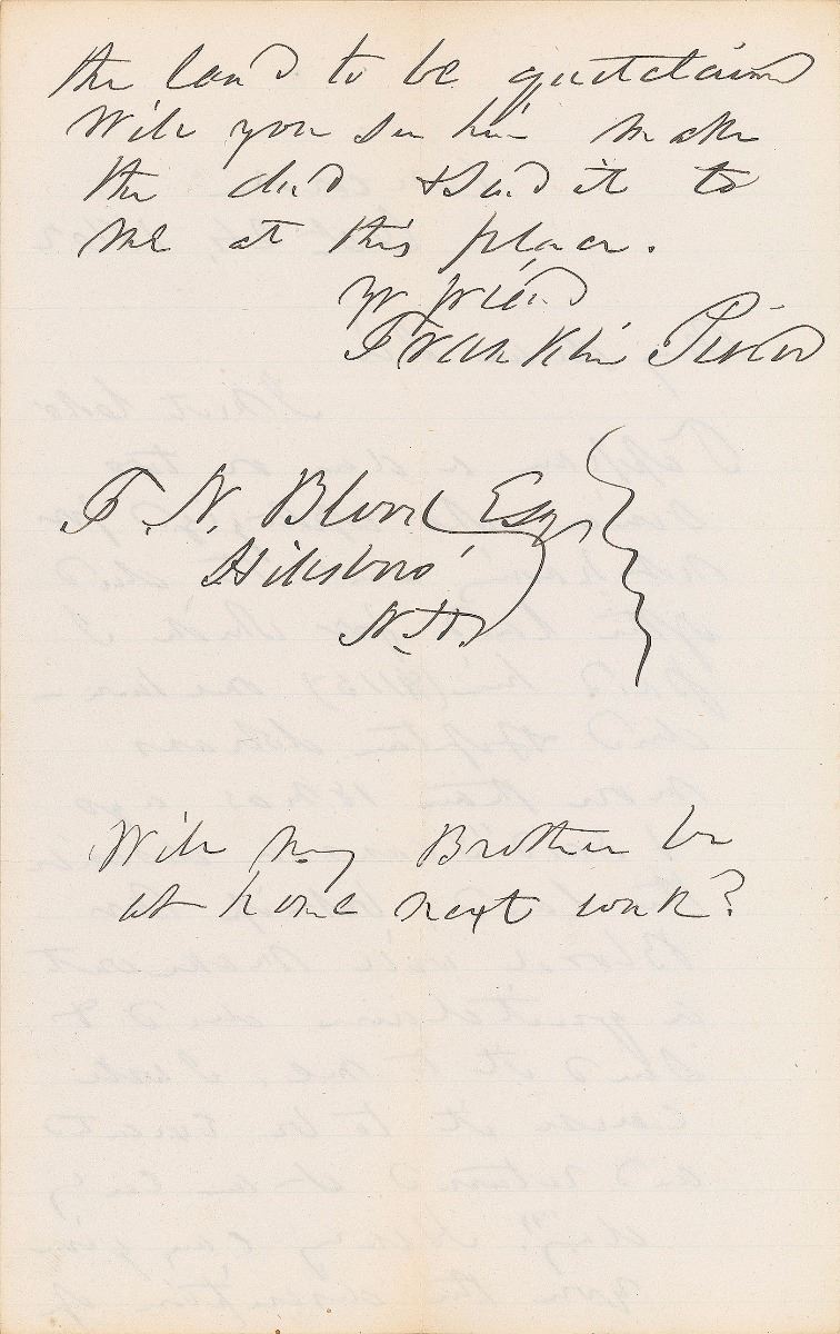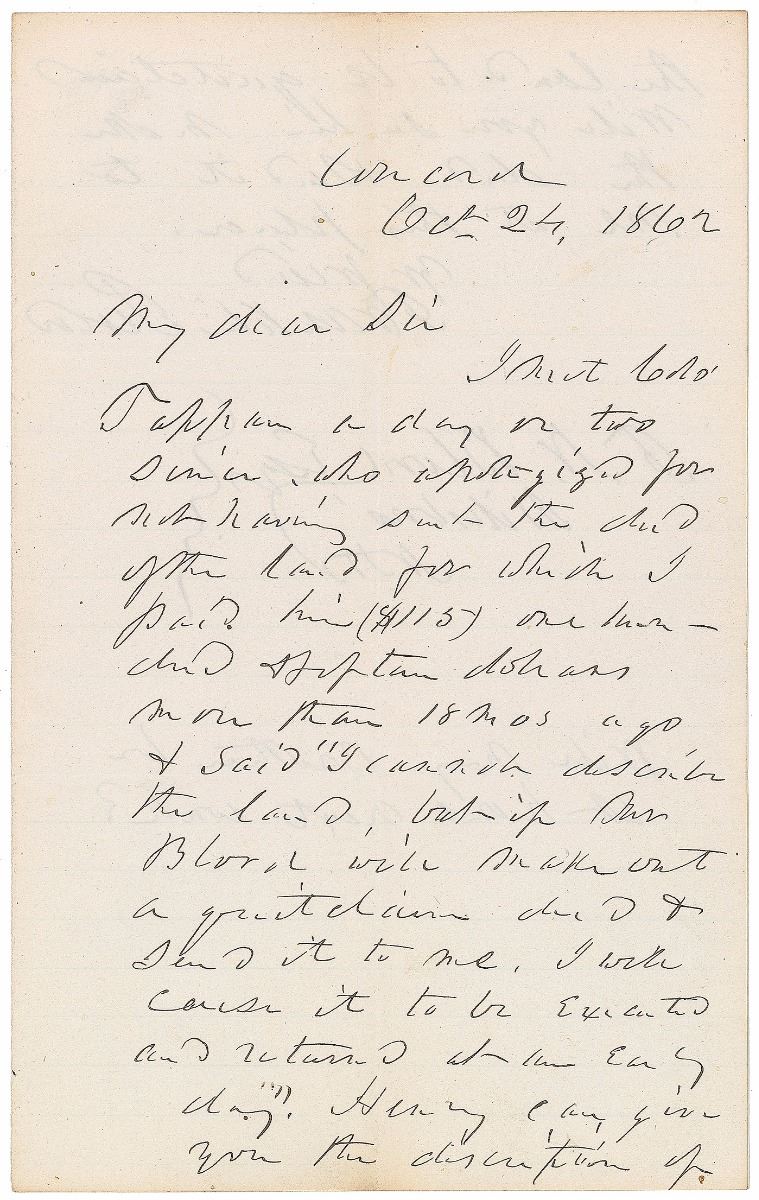 ALS, one page both sides, 5 x 8, October 24, 1862. Letter to F. N. Blood of New Hampshire concerning a real estate transaction. In part: “I met Colo. Tappen a day or two since who apologized for not having sent the deed of the land for which I paid him…more than 18 mos ago & said ‘I cannot describe the land, but if Mr. Blood will make out a quitclaim deed & send it to me, I will cause it to be executed’…Henry can give you the description of the land to be quitclaimed.” In fine condition.