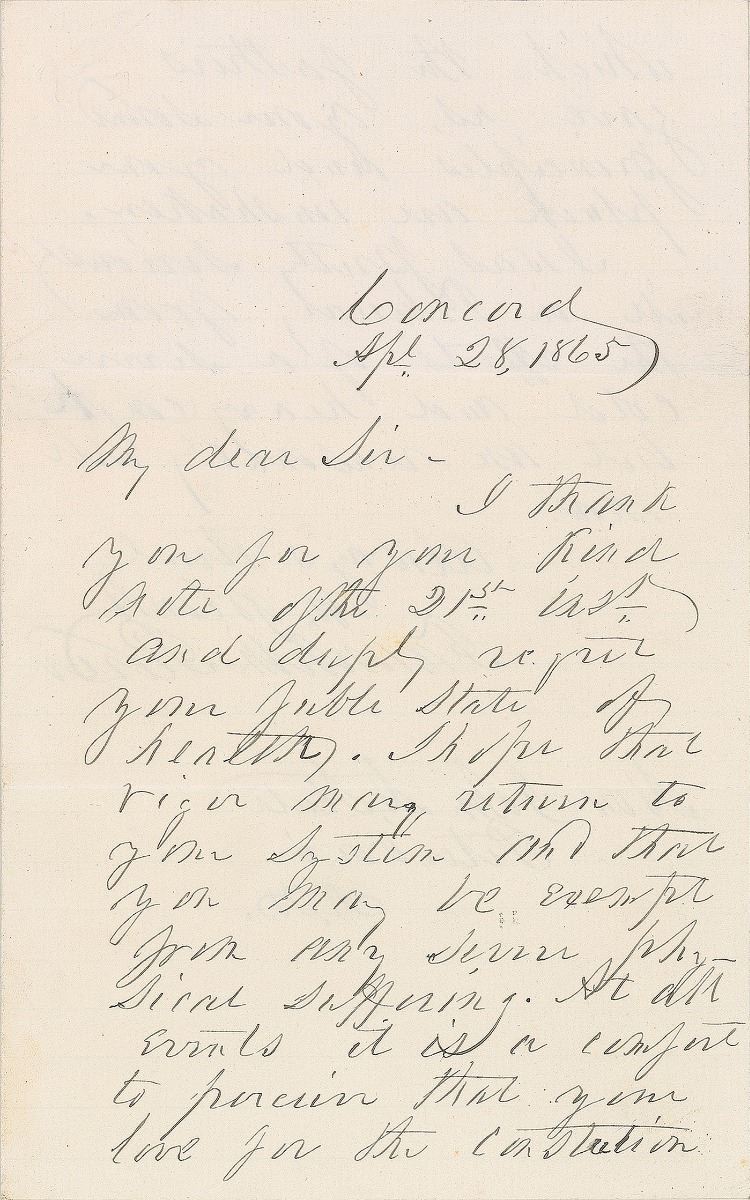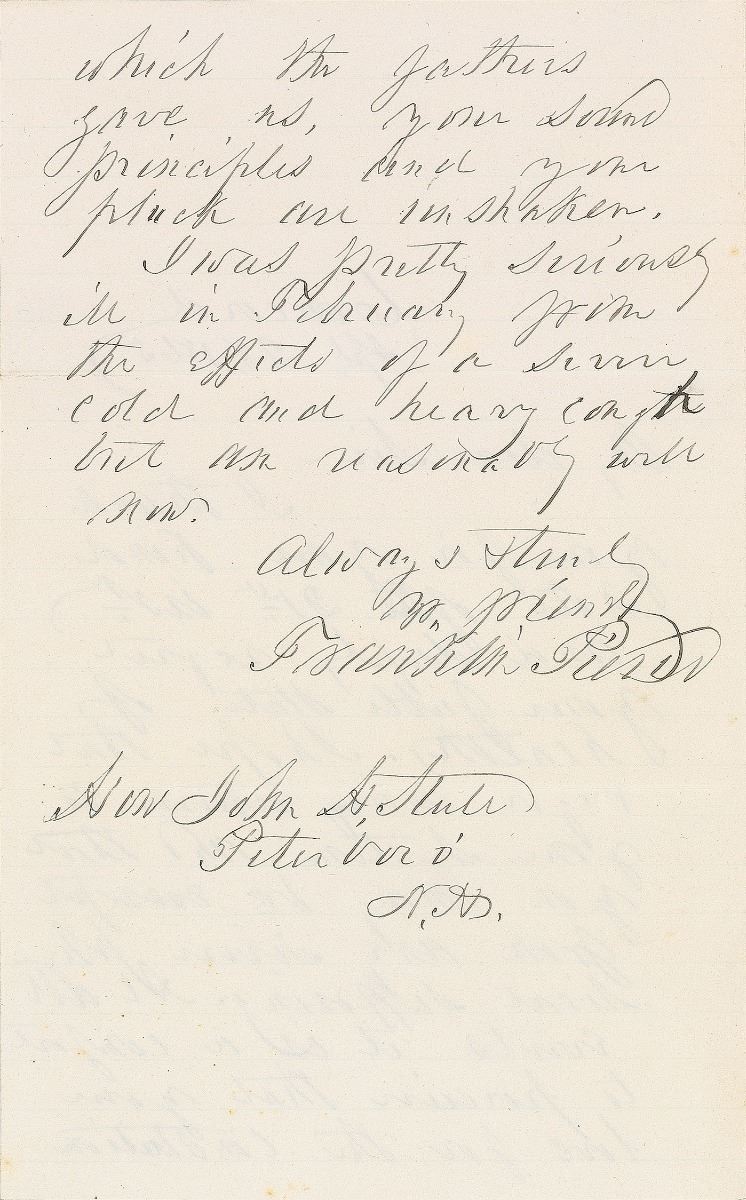 ALS, one page both sides, 5 x 8, April 28, 1865. Letter to former New Hampshire Governor John H. Steele, in full: “I thank you for your kind note of the 21st. inst. and deeply regret your feeble state of health. I hope that vigor may return to your system and that you may be exempt from any severe physical suffering. At all events it is a comfort to perceive that your love for the Constitution which the fathers gave us, your sound principles and your pluck are unshaken. I was pretty seriously ill in February from the effects of a severe cold and heavy cough but am reasonably well now.” In fine condition. Accompanied by the original mailing envelope, written in Pierce’s own hand, as well as an unsigned engraved portrait.