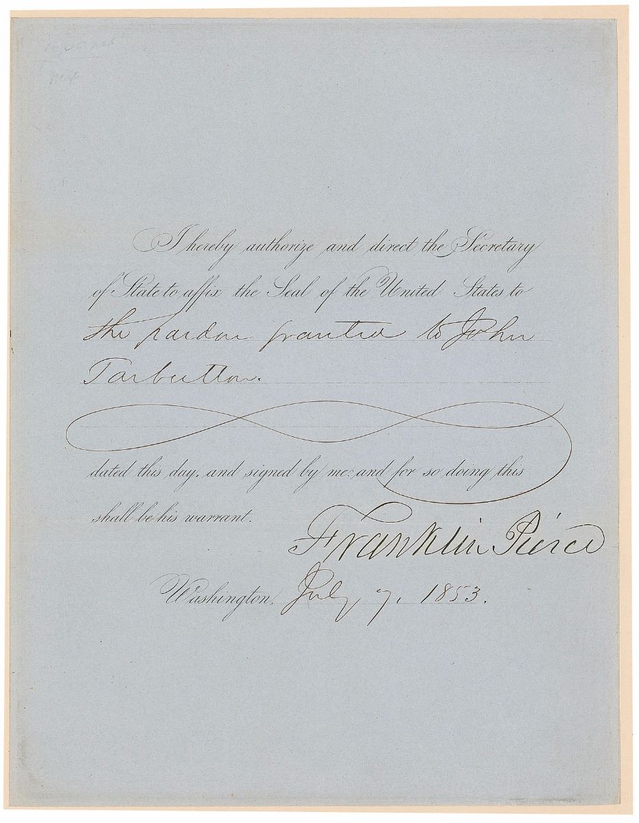 Partly-printed DS as president, signed “Franklin Pierce,” one page, 8 x 10.5, July 7, 1853. President Pierce directs the “Secretary of State to affix the Seal of the United States to the pardon granted to John Tarbutton.” Boldly signed at the conclusion by President Pierce. The second integral page is affixed to a slightly larger cardstock sheet. In fine condition, with intersecting folds and light overall wrinkling. Seven days later Pierce opened the first World’s Fair held in the United States at the New York Crystal Palace.