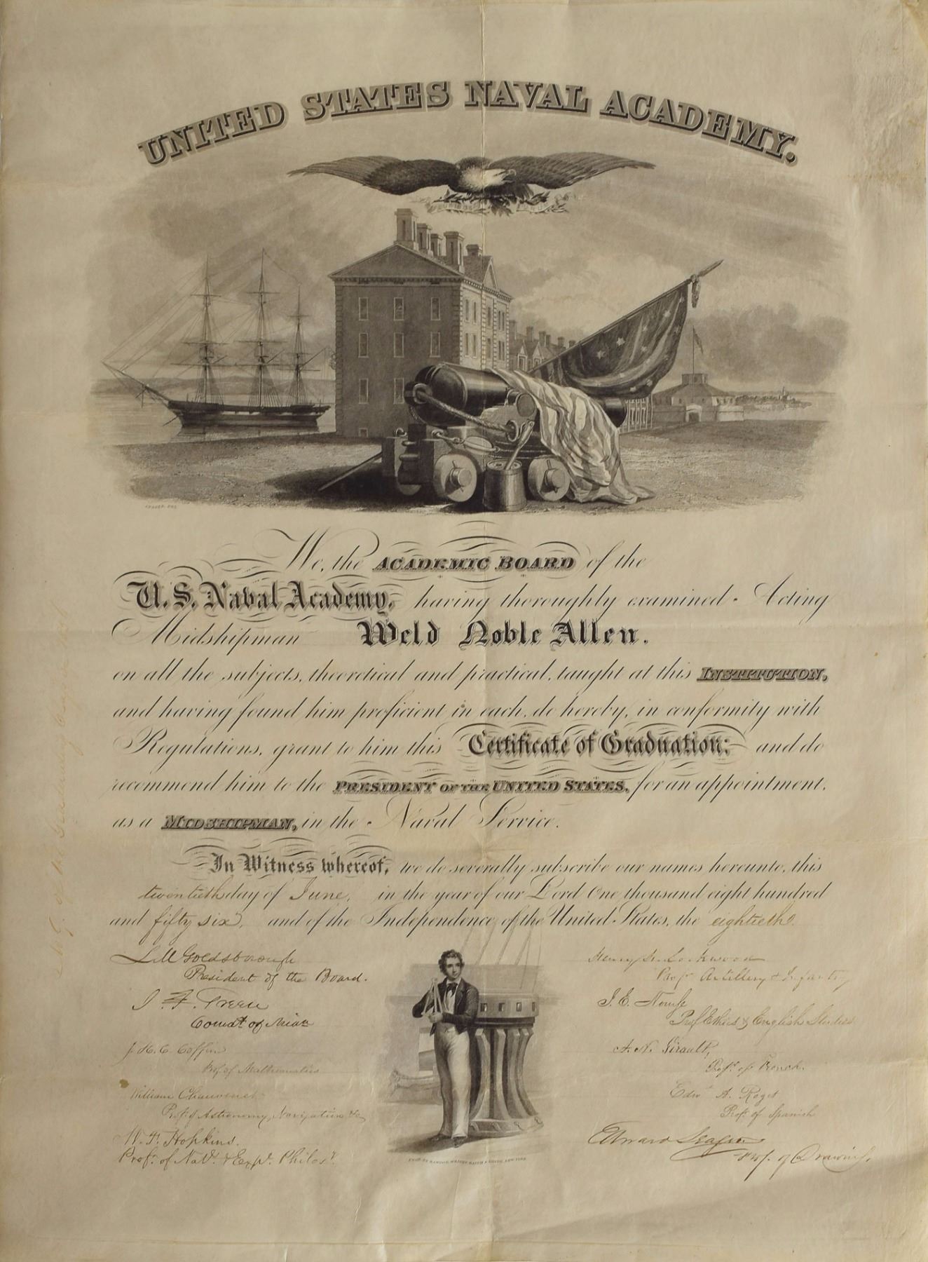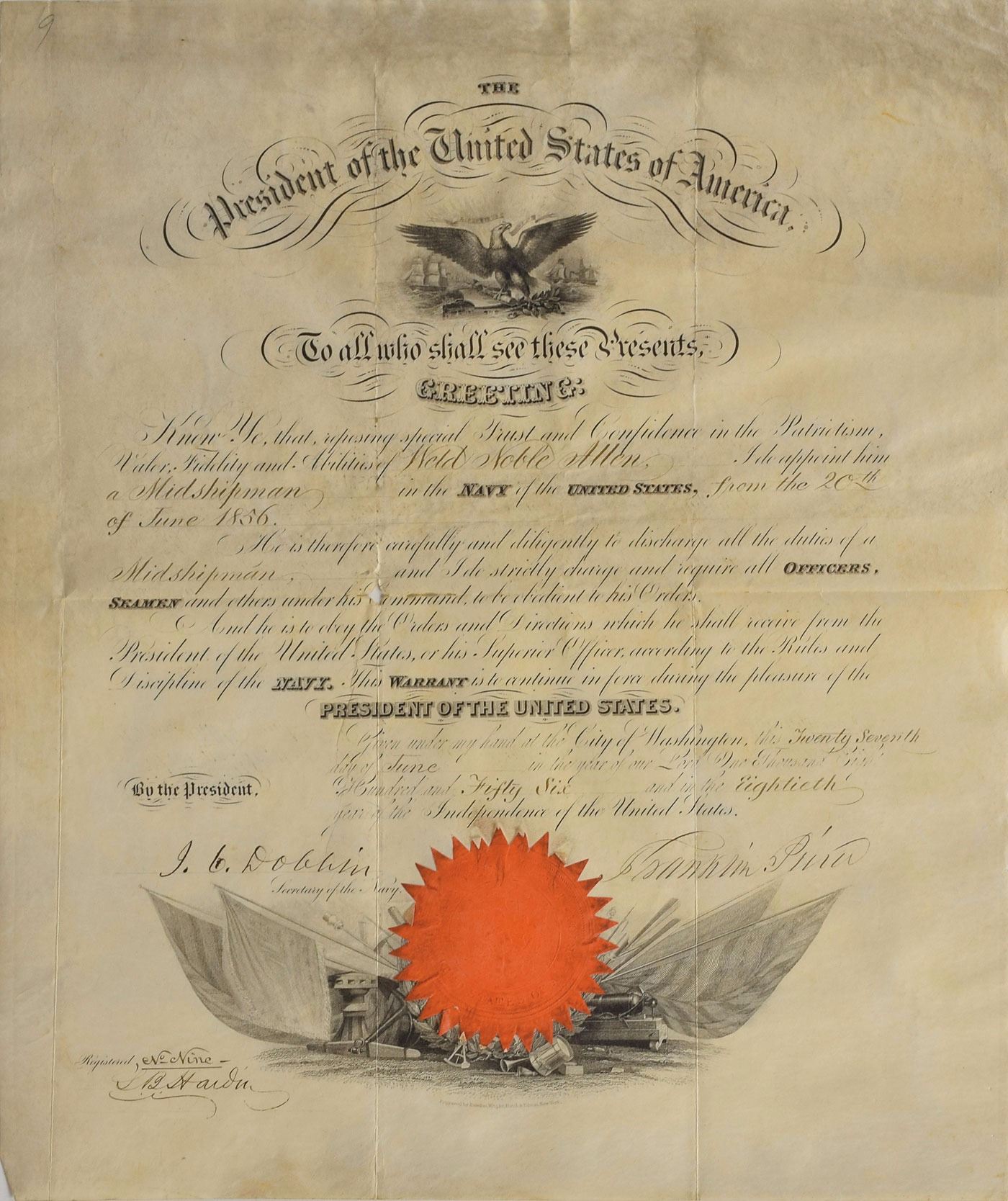 Partly-printed vellum DS as president, one page, 13.75 x 16.25, June 27, 1856. President Pierce appoints Weld Noble Allen as "Midshipman in the Navy of the United States." Signed at the conclusion by Pierce, and countersigned by Secretary of the Navy James C. Dobbin. Orange naval department seal remains affixed to lower vignette. In very good to fine condition, with light overall staining and wrinkling, and a small area of vellum loss at one intersection of folds. Accompanied by a partly-printed vellum United States Naval Academy certificate of graduation for Allen, who would earn further distinction by serving in the Civil War and attaining the rank of lieutenant commander on January 2, 1863.