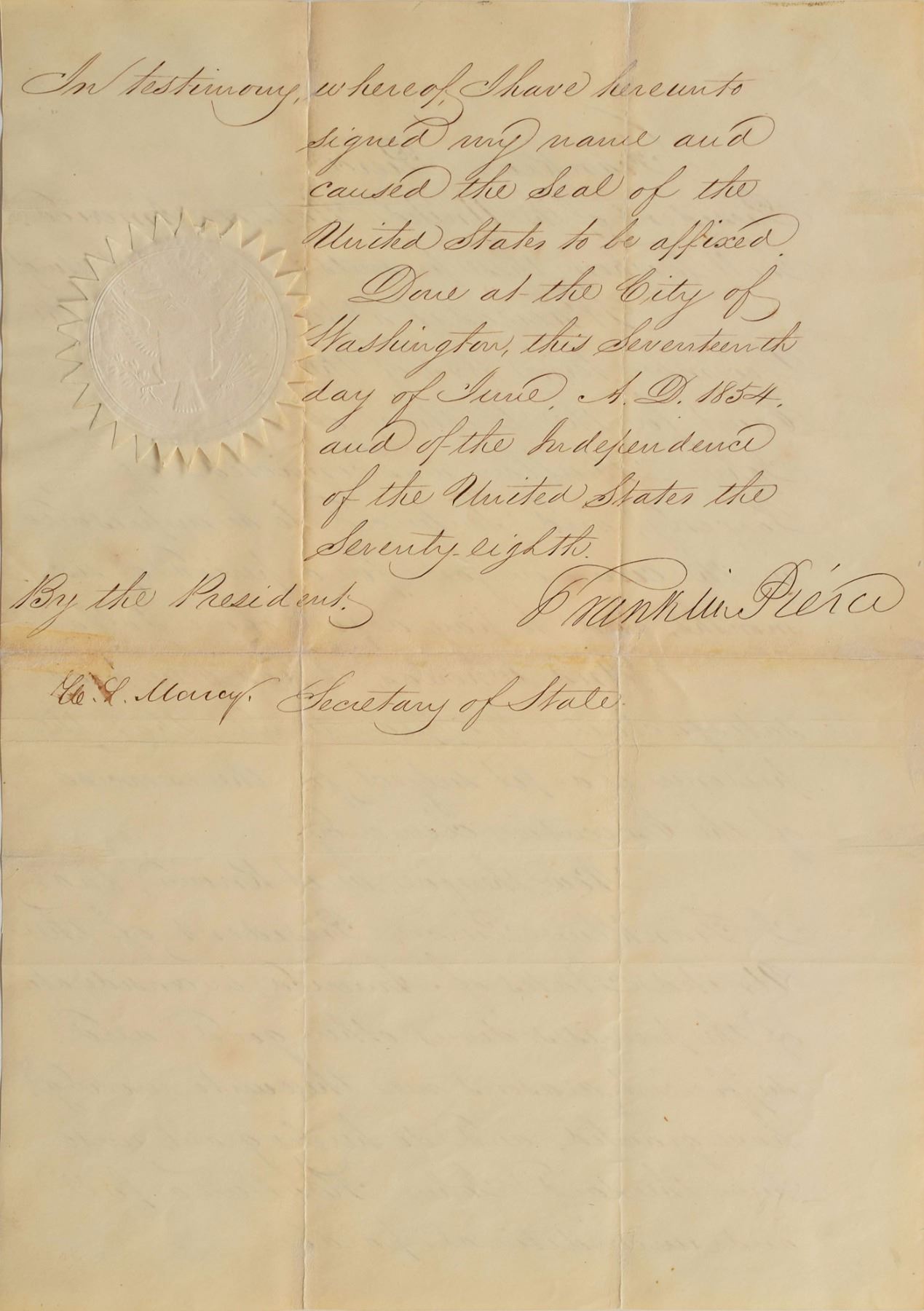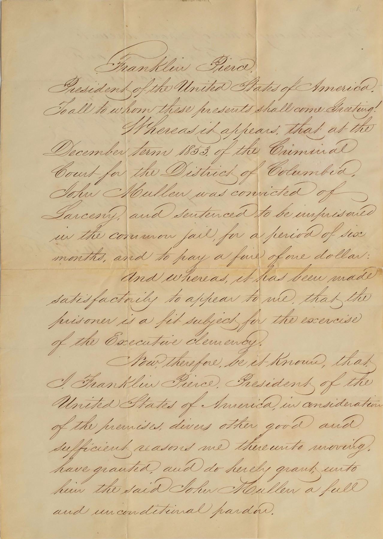 Manuscript DS as president, one page both sides, 10.75 x 15.5, no date. President Pierce issues a pardon. In part: “Whereas…John Mullen was convicted of Larceny, and sentenced to be imprisoned in the common jail for a period of six months, and to pay a fine of one dollar: and whereas, it has been made satisfactorily to appear to me, that the prisoner is a fit subject for the exercise of the Executive clemency…I, Franklin Pierce, President of the United States of America…do hereby grant unto him the said John Mullen a full and unconditional pardon.” Prominently signed at the conclusion by Pierce, and countersigned by Secretary of State William L. Marcy. The white paper seal affixed to the upper left remains fully intact and extremely crisp. In very good to fine condition, with very unobtrusive repairs to splitting along intersecting folds.