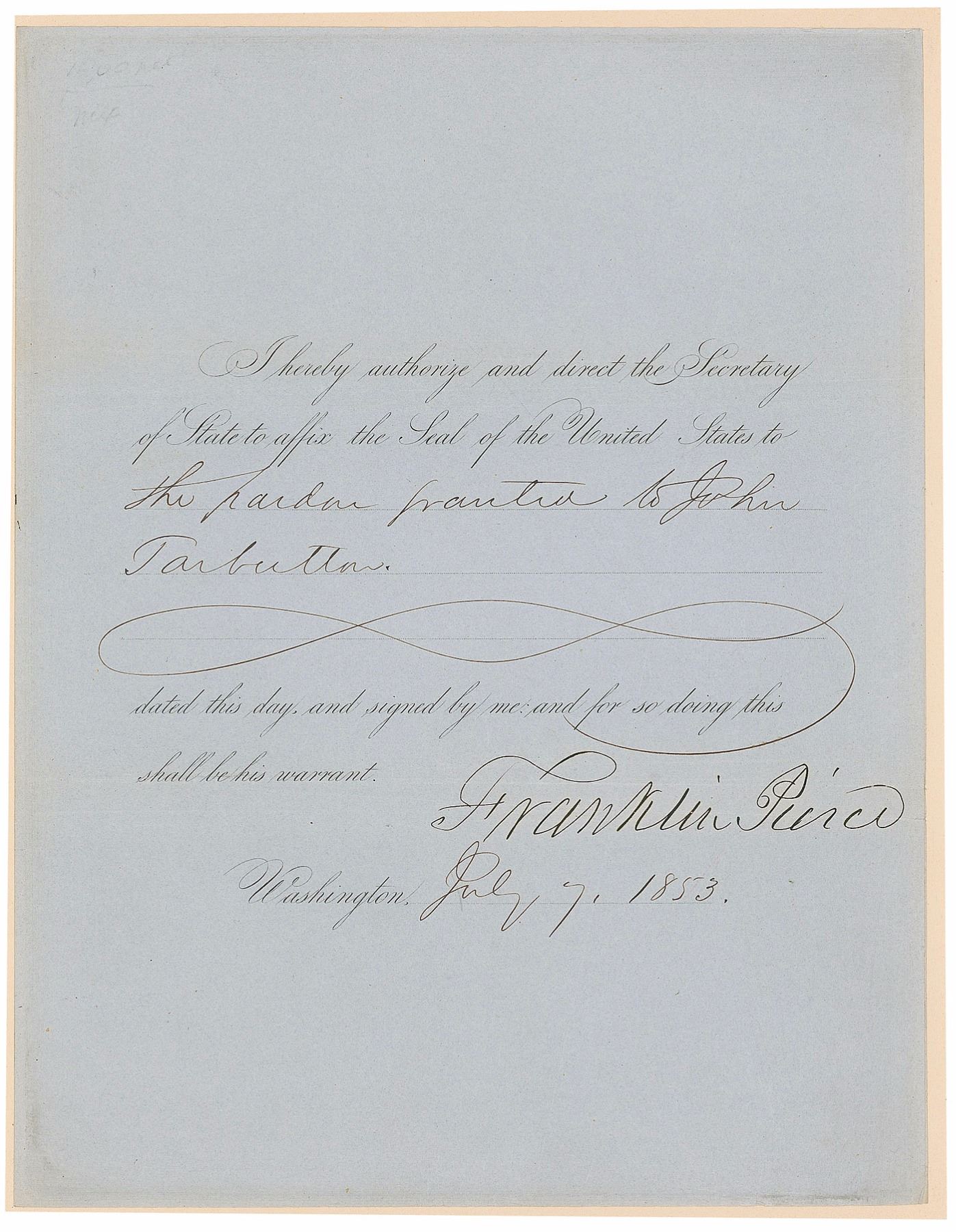 Partly-printed DS as president, signed "Franklin Pierce," one page, 8 x 10.5, July 7, 1853. President Pierce directs the "Secretary of State to affix the Seal of the United States to the pardon granted to John Tarbutton." Boldly signed at the conclusion by President Pierce. The second integral page is affixed to a slightly larger cardstock sheet. In fine condition, with intersecting folds and light overall wrinkling. Seven days later Pierce opened the first World's Fair held in the United States at the New York Crystal Palace.