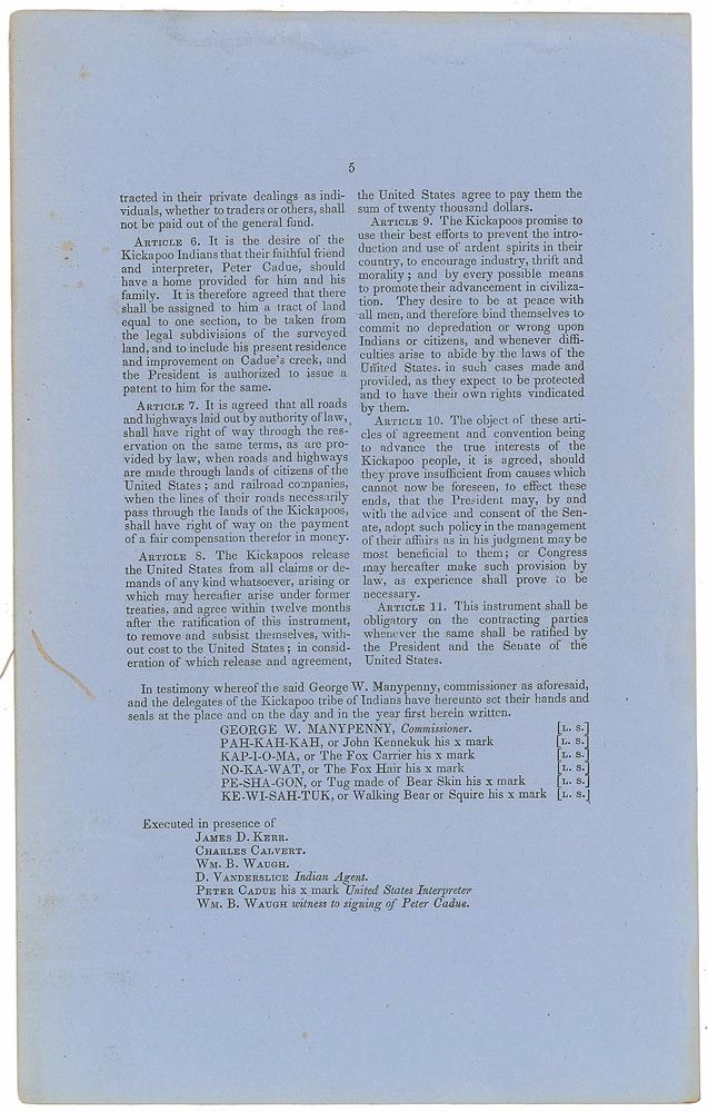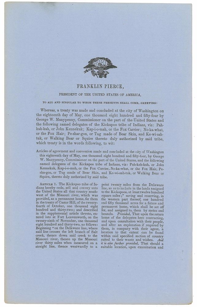 Unsigned pamphlet entitled "Treaty between the United States and the Kickapoo Indians," six total pages, 7.75 x 12.25, July 17, 1854. Issued by President Franklin Pierce and arranged by George Manpenny as the director of the Bureau of Indian Affairs of the United States, the treaty reads, in part: "The Kickapoo tribe of Indians hereby cede, sell and convey unto the United States all that country southwest of the Missouri River…Beginning 'on the Delaware line, where said line crosses the left branch of Salt Creek…so as to include in the lands assigned to the Kickapoos, at least twelve hundred square miles;' saving and reserving, in the western part thereof, one hundred and fifty thousand acres for a future and permanent home, which shall be set off for, and assigned to, them by metes and bounds…In consideration whereof the United States agree to pay to the said Indians, under the direction of the President and in such manner as he shall from time to time prescribe, the sum of three hundred thousand dollars." The pamphlet was originally loosely stitched together, but has since become separated into two bi-folds. In fine condition, with light toning along the outer edges.