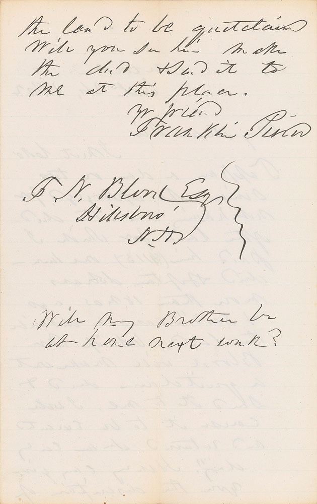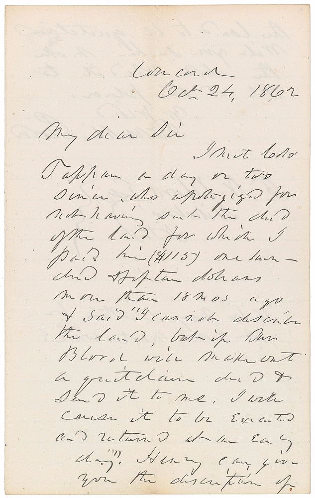 ALS, one page both sides, 5 x 8, October 24, 1862. Letter to F. N. Blood of New Hampshire concerning a real estate transaction. In part: “I met Colo. Tappen a day or two since who apologized for not having sent the deed of the land for which I paid him…more than 18 mos ago & said ‘I cannot describe the land, but if Mr. Blood will make out a quitclaim deed & send it to me, I will cause it to be executed’…Henry can give you the description of the land to be quitclaimed.” In fine condition.