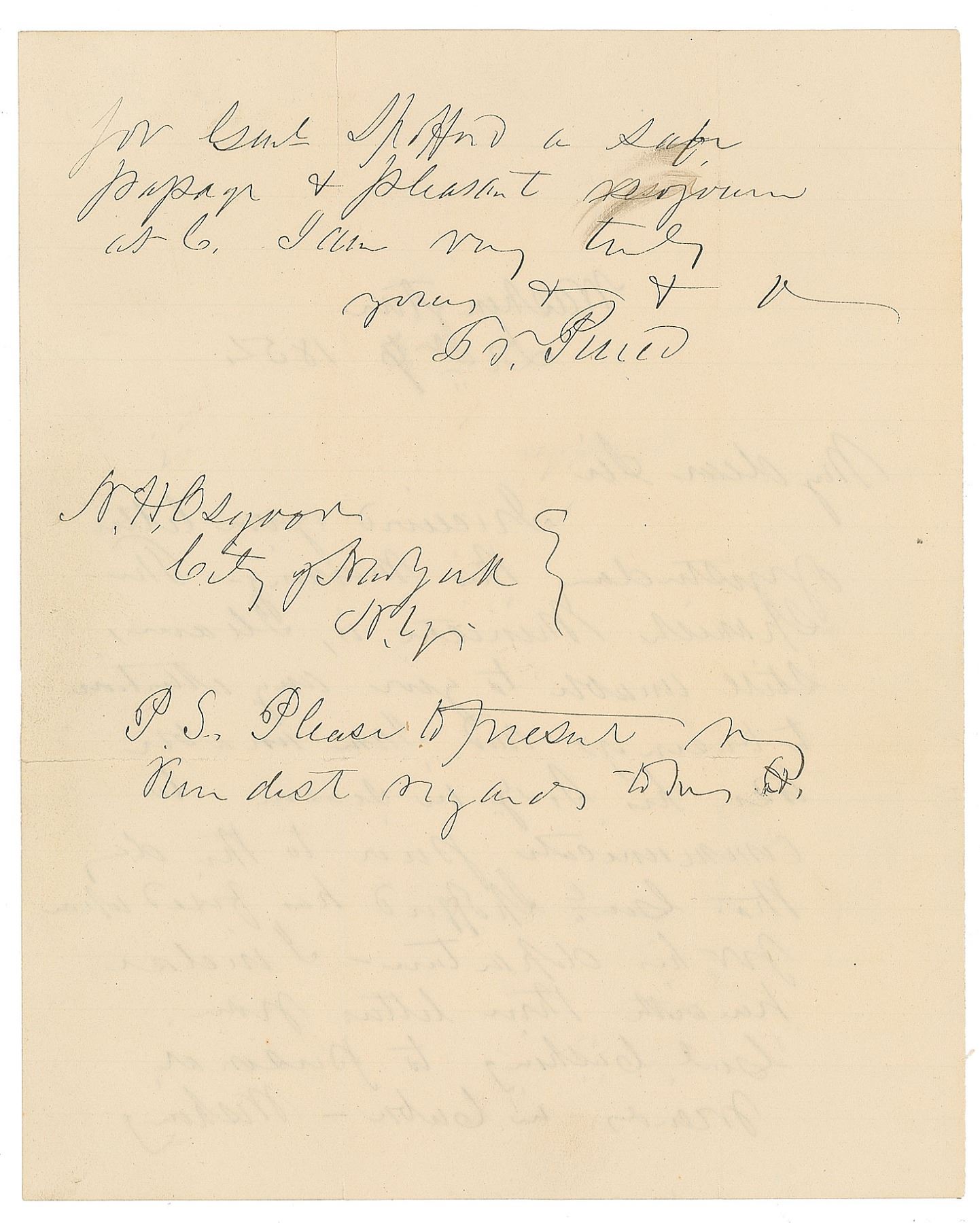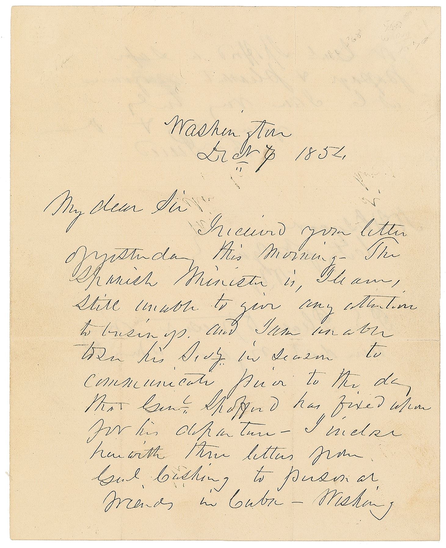 ALS as president signed “Fr. Pierce,” one page both sides, 5.75 x 7, December 7, 1854. Letter to N. H. Osgood in New York. In part: “The Spanish Minister is, I learn, still unable to give any attention to business and I am unable to see his Secy in season to communicate prior to the day that Genl. Spofford has fixed upon for his departure—I inclose herewith three letters from Genl. Cushing to personal friends in Cuba—Wishing for Genl. Spofford a safe passage & pleasant sojourn.” In fine condition, with intersecting folds with one small edge separation and brushing to ink in a couple words. Provenance: The Everett Fisher Collection. One goal of the Pierce administration was to purchase Cuba from Spain, and the Ostend Manifesto was drafted in 1854 to describe the rationale. The plan came under attack for its advocacy of military intervention if Spain refused as well as its intention to make Cuba a ‘slave’ state. The public outcry forced Pierce to shelve his plans to annex Cuba and dealt a severe blow to his administration.