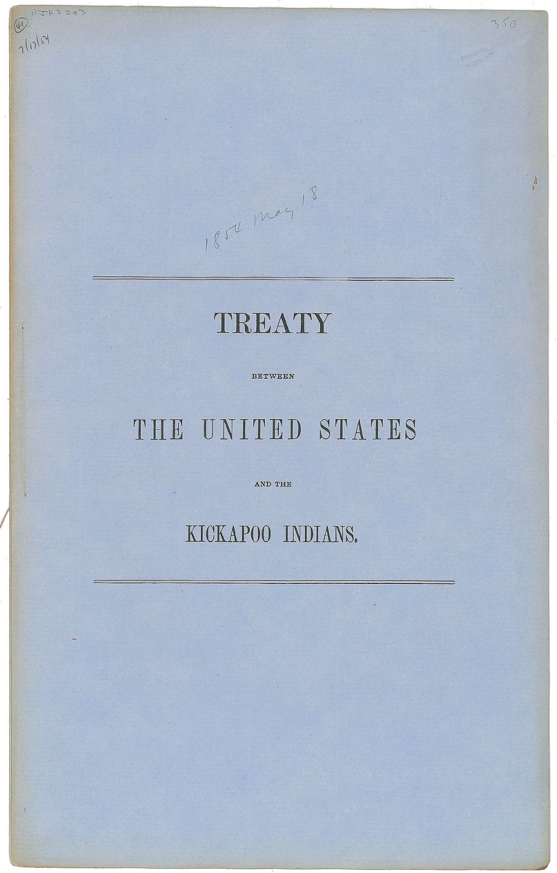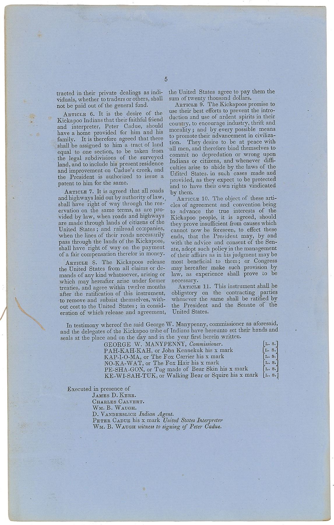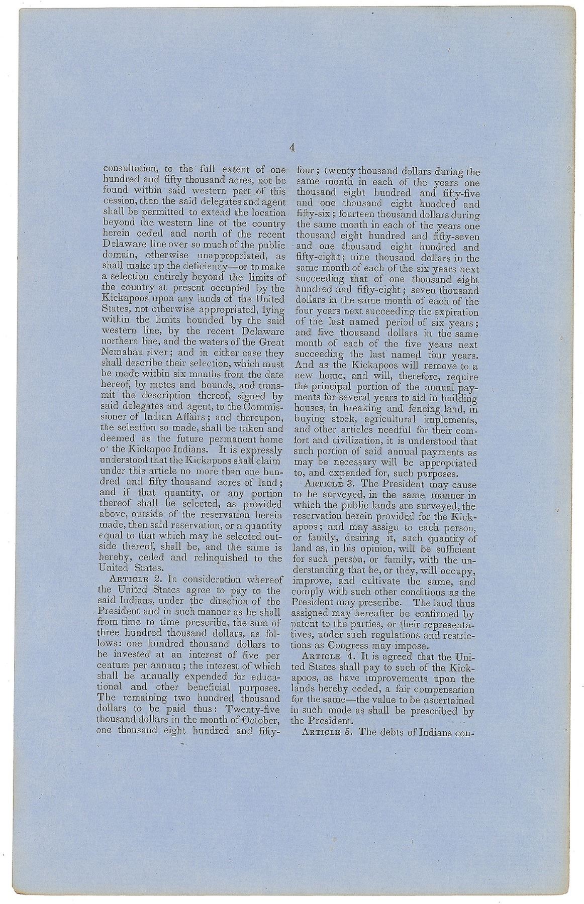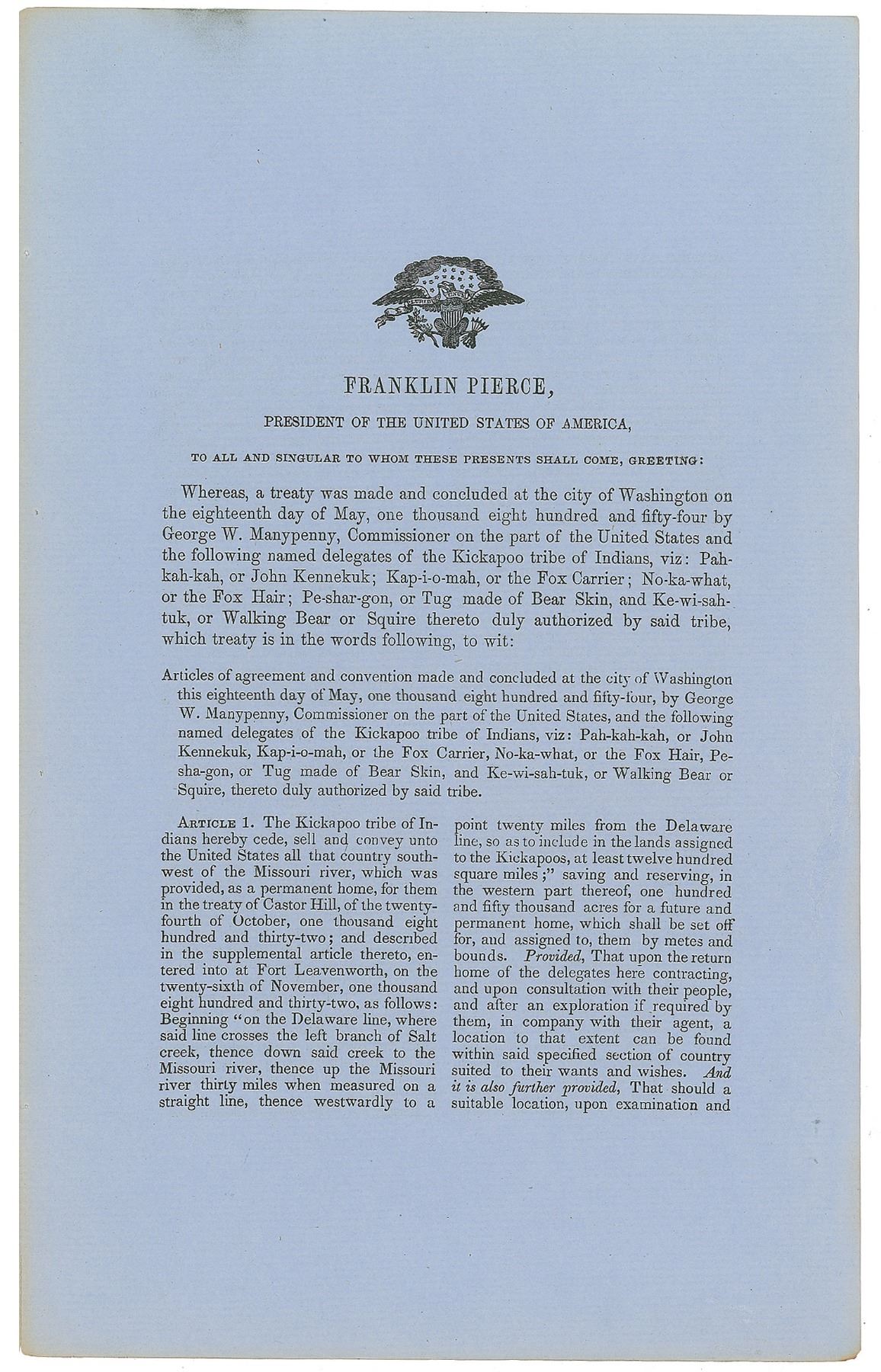 Unsigned pamphlet entitled "Treaty between the United States and the Kickapoo Indians," six total pages, 7.75 x 12.25, July 17, 1854. Issued by President Franklin Pierce and arranged by George Manpenny as the director of the Bureau of Indian Affairs of the United States, the treaty reads, in part: "The Kickapoo tribe of Indians hereby cede, sell and convey unto the United States all that country southwest of the Missouri River…Beginning 'on the Delaware line, where said line crosses the left branch of Salt Creek…so as to include in the lands assigned to the Kickapoos, at least twelve hundred square miles;' saving and reserving, in the western part thereof, one hundred and fifty thousand acres for a future and permanent home, which shall be set off for, and assigned to, them by metes and bounds…In consideration whereof the United States agree to pay to the said Indians, under the direction of the President and in such manner as he shall from time to time prescribe, the sum of three hundred thousand dollars." The pamphlet was originally loosely stitched together, but has since become separated into two bi-folds. In fine condition, with light toning along the outer edges.