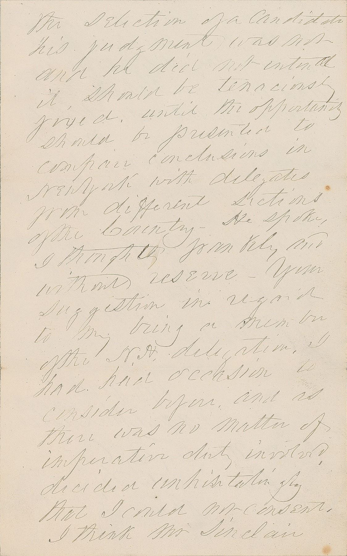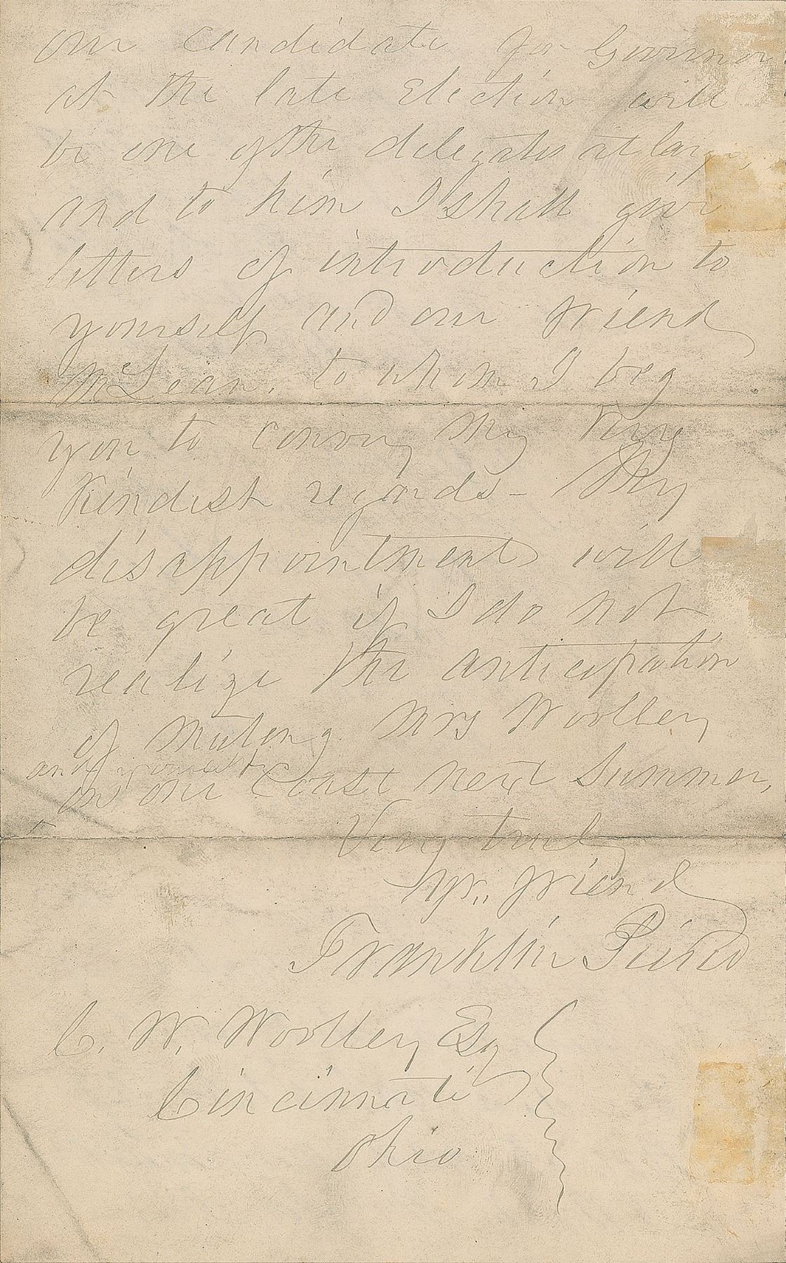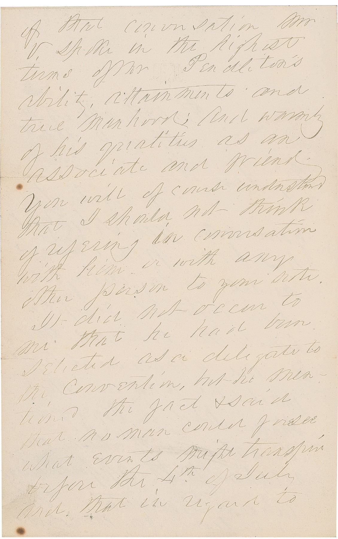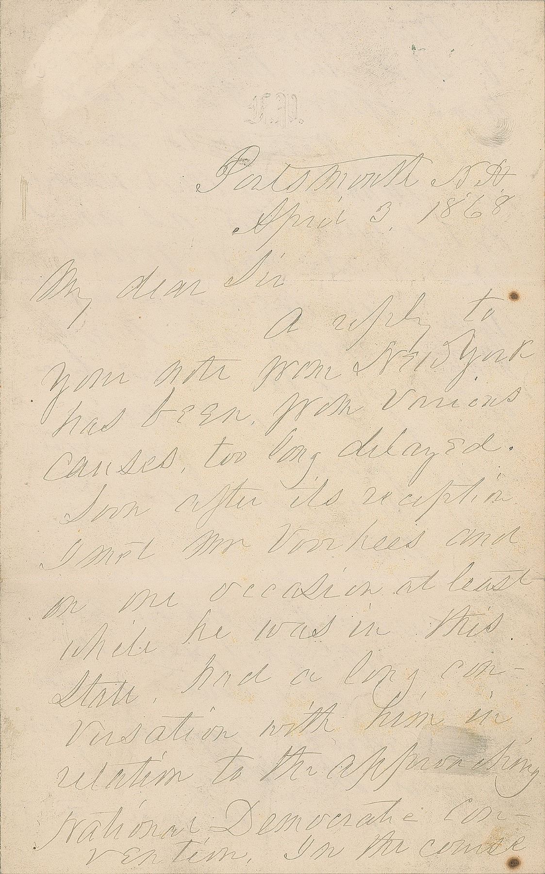 ALS, four pages on two adjoining sheets, 5 x 8, blindstamped monogram letterhead, April 3, 1868. Letter to C. W. Woolley of Cincinnati, in part: "A reply to your note from New York has been, from various causes, too long delayed. Soon after its reception I met Mr. Voorhees and on one occasion at least while he was in this state, had a long conversation with him in relation to the approaching National Democratic Convention. In the course of that conversation Mr. V. spoke in the highest terms of Mr. Pendleton's ability, attainments and true manhood; and warmly of his qualities as an associate and friend…It did not occur to me that he had been selected as a delegate to the convention, but he mentioned the fact & said that no man could foresee what events might transpire before the 4th of July and that in regard to the selection of a candidate his judgment was not and he did not intend it, should be tenaciously fixed, until the opportunity presented to compare conclusions in New York with delegates from different sections of the Country…Your suggestion in regard to my being a member of the N.H. delegation, I had had occasion to consider before, and as there was no matter of imperative duty involved, decided…that I could not consent. I think Mr. Sinclair our candidate for Governor at the late election will be one of the delegates." In very good condition, with splitting to the hinge, a few small stains, and soiling and old tape residue to the final page. The 1868 Democratic National Convention was held at Tammany Hall in New York, and resulted in the nomination of Horatio Seymour for the presidency.