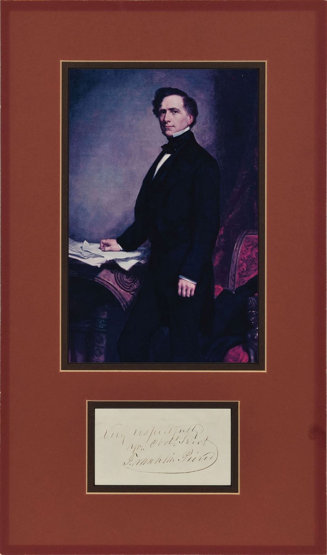 Ink signature, "Very respectfully, yr. Obd't Serv't, Franklin Pierce,” on an off-white 4.5 x 2.5 sheet. Double-matted with a portrait of Pierce to an overall size of 10.75 x 18.25. In fine condition, with light wrinkling, and a fold above the sentiment.