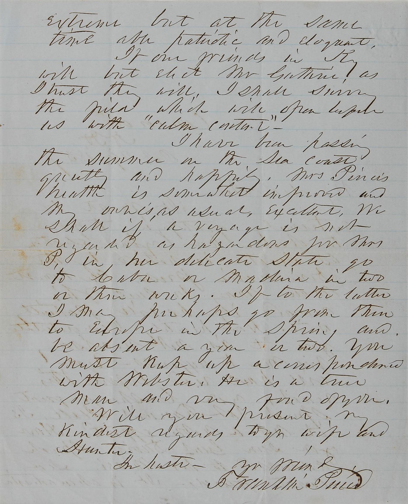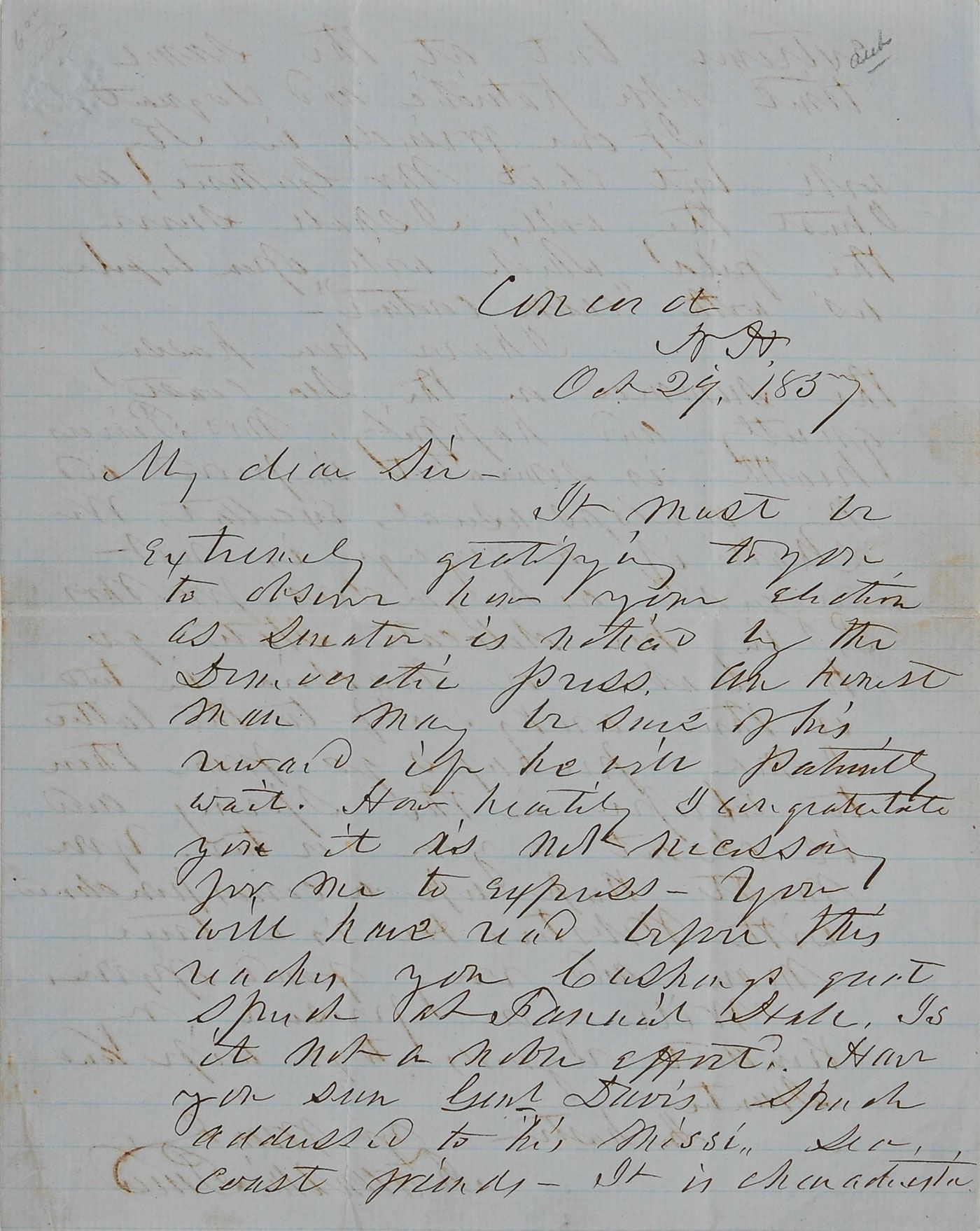 ALS as president, one page both sides, lightly lined, 7.75 x 9.75, October 29, 1857. In part: "It must be extremely gratifying to you to observe how your election as senator is noticed by the Democratic press. An honest man may be sure of his reward if he will patiently wait. How heartily I congratulate you it is not necessary for me to express…Have you seen Genl. Davis' speech addressed to his Missi. Seacoast friends—It is characteristically extreme but at the same time able, patriotic and eloquent…I have been passing the summer on the sea coast quietly and happily. Mrs. Pierce's health is somewhat improved and my own is, as usual, excellent." In fine condition, with writing showing through from opposing sides.