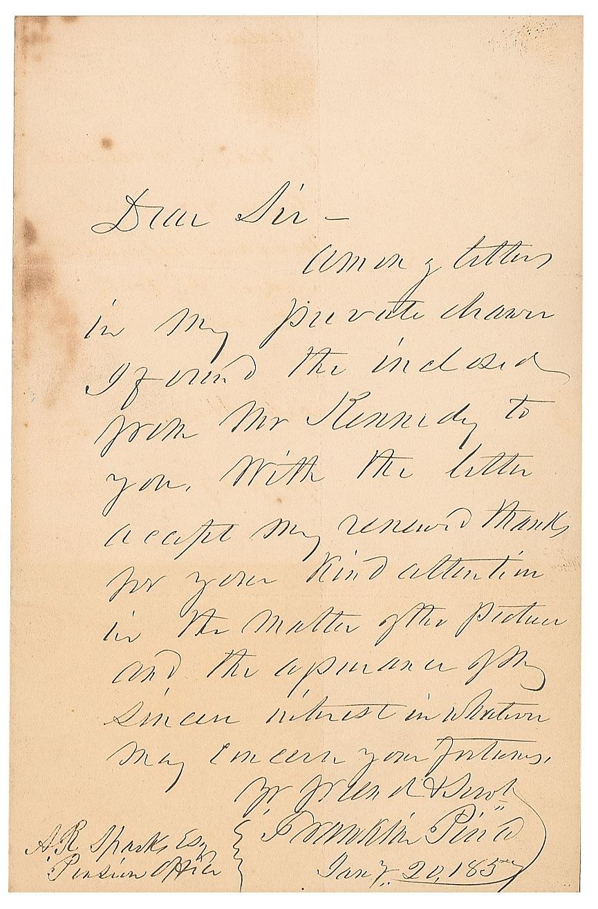 ALS as president, one page, 5 x 7.5, January 20, 1857. Letter to A. R. Sparks, a pension officer, in full: "Among letters in my private drawer I found the inclosed from Mr. Kennedy to you. With the letter accept my renewed thanks for your kind attention in the matter of the picture and the assurance of my sincere interest in whatever may concern your fortunes." In very good to fine condition, with some staining and toning, and old mounting residue on the back of the blank adjoining page.