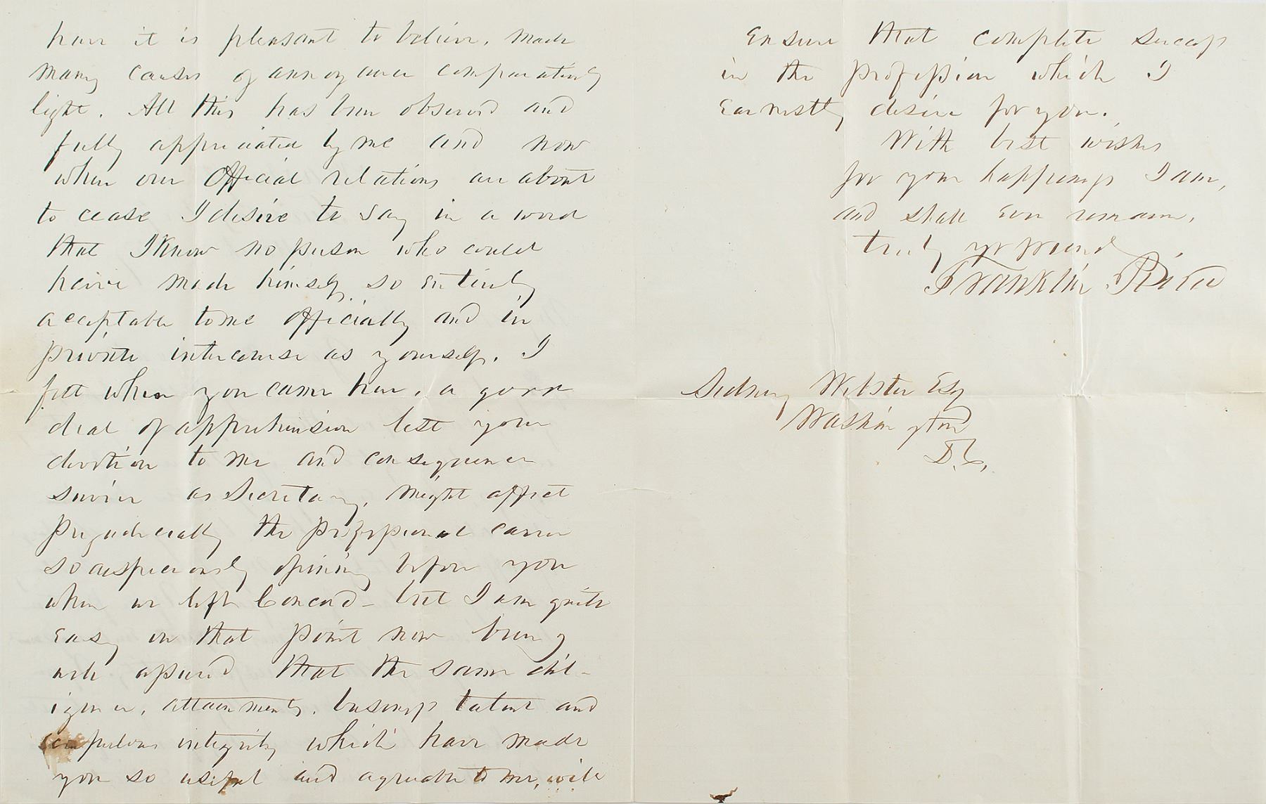 ALS as president, three pages on two adjoining sheets, 7.75 x 9.75, March 3, 1857. Letter to his secretary Sydney Webster, written on the second-to-last day of his term as president, in part: "You need no assurance of my true and enduring friendship for you but I feel that a pleasing duty would be neglected if I were not to express, how entirely agreeable in all respects has been your discharge of official duty as my private secretary during the last four years. Your position has been one, at times of great embarrassment and always of much responsibility. Your attachment for me personally and your interest in whatever has concerned my fame or fortunes while they have increased your solicitude have it is pleasant to believe, made many causes of annoyance comparatively light. All this has been observed and fully appreciated by me and now when our official relations are about to cease I desire to say in a word that I know no person who could have made himself so entirely acceptable to me officially and in private intercourse as yourself." In fine condition. Accompanied by the hand-addressed mailing envelope from Pierce, as well as another mailing envelope penned in the hand of Webster and marked "Important."
