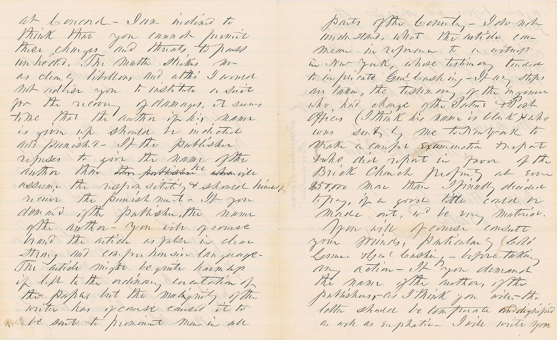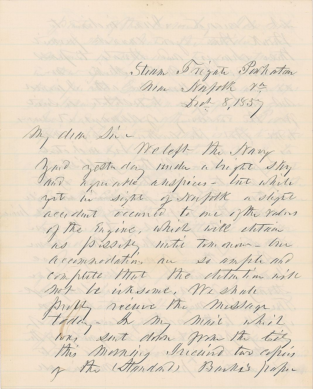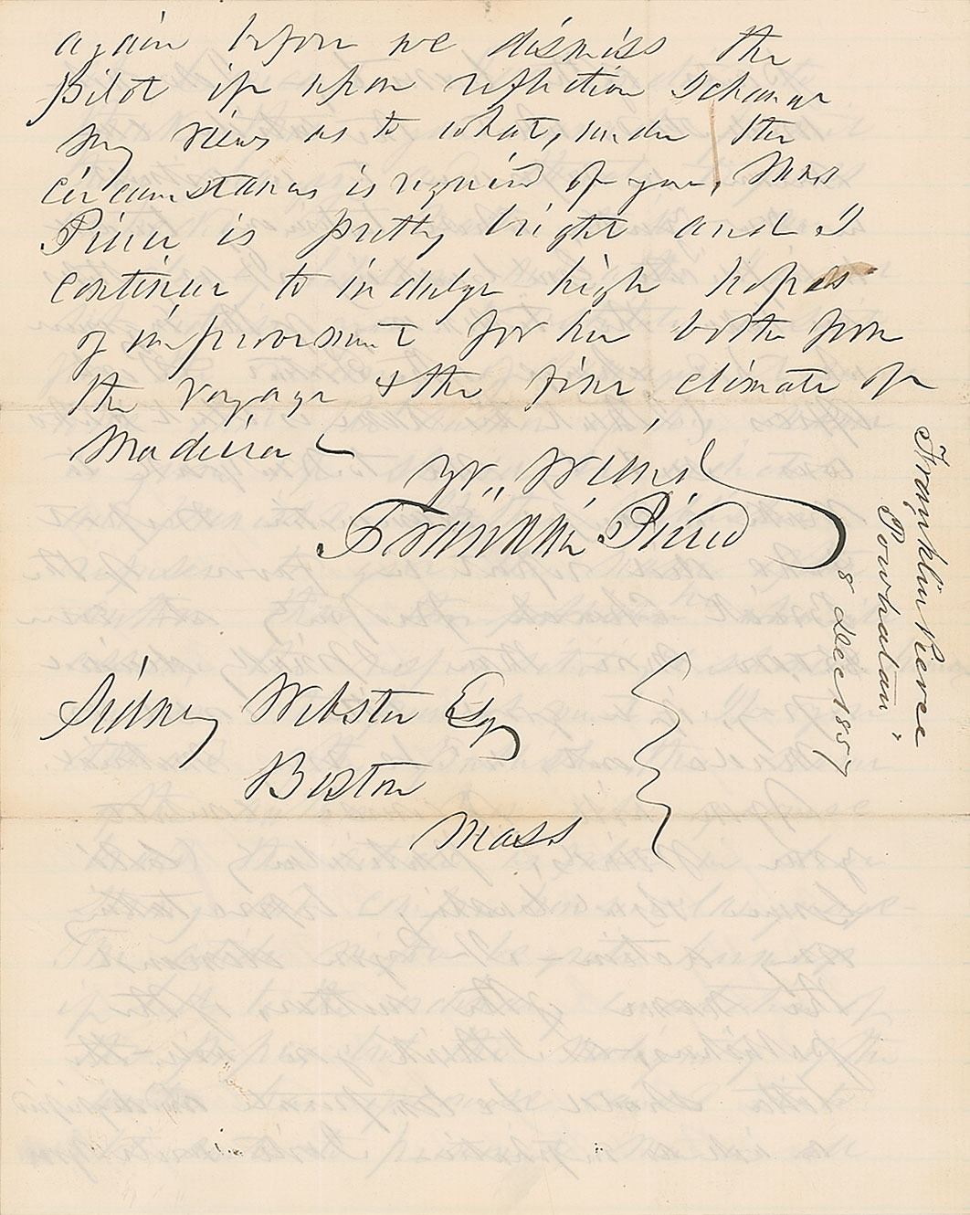 ALS, four pages on two adjoining sheets, 7.75 x 9.75, December 8, 1857. Letter to his former private White House secretary Sidney Webster, written from aboard the steam frigate USS Powhatan en route to Madeira, in part: "When we left the Navy Yard yesterday under a bright sky and agreeable auspices, but while yet in site of Norfolk a slight accident occurred to one of the valves of the engine, which will detain us possibly until tomorrow. Our accommodations are so ample and complete that the detention will not be irksome. We shall probably receive the message today. In my mail which was sent down from the city this morning I received two copies of the (standard) Burke's paper at Concord. I am inclined to think that you cannot permit these charges and threats to pass unchecked. The matter strikes me as clearly libelous and altho' I would not advise you to institute a suit for the recovery of damages, it seems to me that the author if his name is given up should be indicted and punished. If the publisher refuses to give the name of the author then he assumes the responsibility & should himself receive the punishment. If you demand of the publisher the name of the author you will of course hand the brand the article as false in clear strong and comprehensive language. The article might be quite harmless if left to the ordinary…but the malignity of the writer has of course caused it to be sent to prominent men in all parts of the Country. I do not understand what an article can mean in reference to a witness in New York, whose testimony tended to implicate Genl. Cushing. If any steps are taken, the testimony of the engineer who had charge of the Patent & Post office (I think his name is Clark) & who was sent by me to New York to make a careful examination & report & who did report in favor of the Brick Church property at even $50,000 more than I finally decided to pay if a good title could be made out, w'd be very material. You will of course consult your friends particularly Colo. Green & Genl. Cushing, before taking any action…Mrs. Pierce is pretty blight and I continue to indulge high hopes of improvement for her both from the voyage & the fine climate of Madeira." In fine condition.
