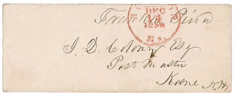 Hand-addressed and free franked envelope, 5.5 x 2.25, addressed to “J. D. Colony Esq., Post Master, Keene, NH,” and franked at the top, “Franklin Pierce.” Envelope also bears a December 14, 1858, postal cancellation. In fine condition, with light toning, and postmark over portion of franking signature. Pre-certified John Reznikoff/PSA/DNA and RRAuction COA.
