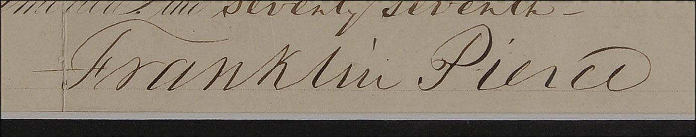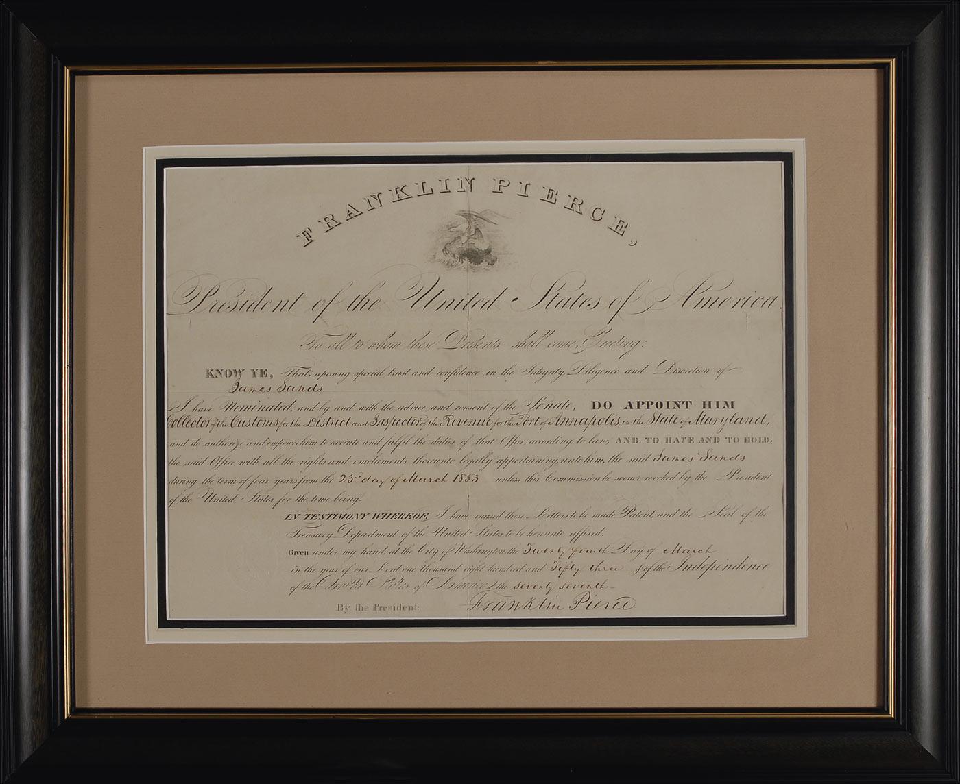 Partly-printed DS as president, one page, 14.75 x 11, March 24, 1853. President Pierce appoints James Sands “Collector of the Customs for the District and Inspector of the Revenue for the Port of Annapolis, in the State of Maryland.” Neatly signed at the conclusion by Pierce. Triple suede matted and framed to an overall size of 23.5 x 19.5. In fine condition, with intersecting folds, with a couple small separations along bisecting vertical fold, and a light overall shade of toning. Pre-certified John Reznikoff/PSA/DNA and RRAuction COA.