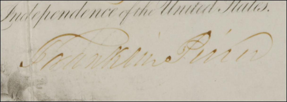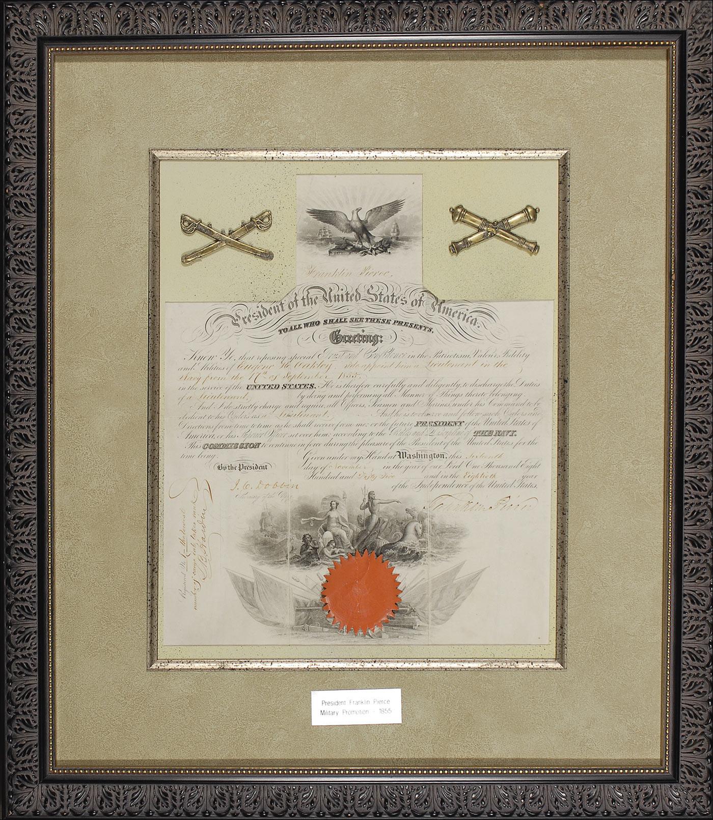 Partly-printed DS as president, one page, 14 x 17, November 16, 1855. President Pierce appoints Eugene H. Oakley a Lieutenant in the Navy. Signed at the conclusion in ink by Pierce and countersigned by Secretary of the Navy J. C. Dobbin. Double matted and framed to an overall size of 26 x 29.5. In very good condition, with intersecting folds, some mild toning, and handwritten portions of text a couple shades light. The orange seal is worn and partially detached, but intact. Oversized. Pre-certified John Reznikoff/PSA/DNA and RRAuction COA.