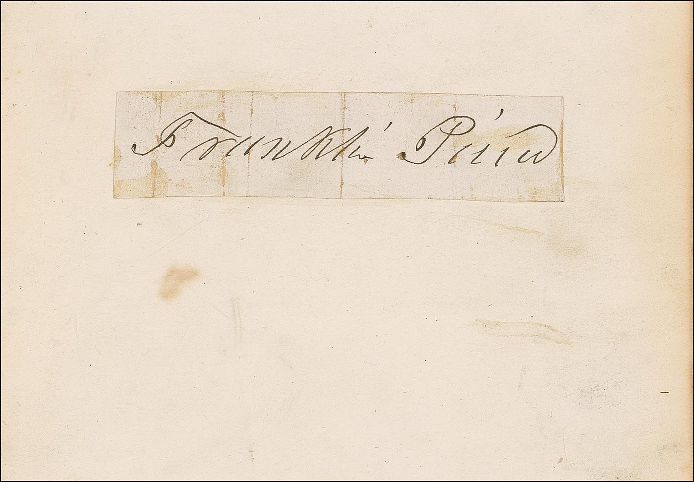 Ink signature, “Franklin Pierce,” on an off-white 3.5 x 1 slip affixed to a 5.5 x 4 off-white slip. In very good condition, with several vertical creases and scattered light toning and soiling.