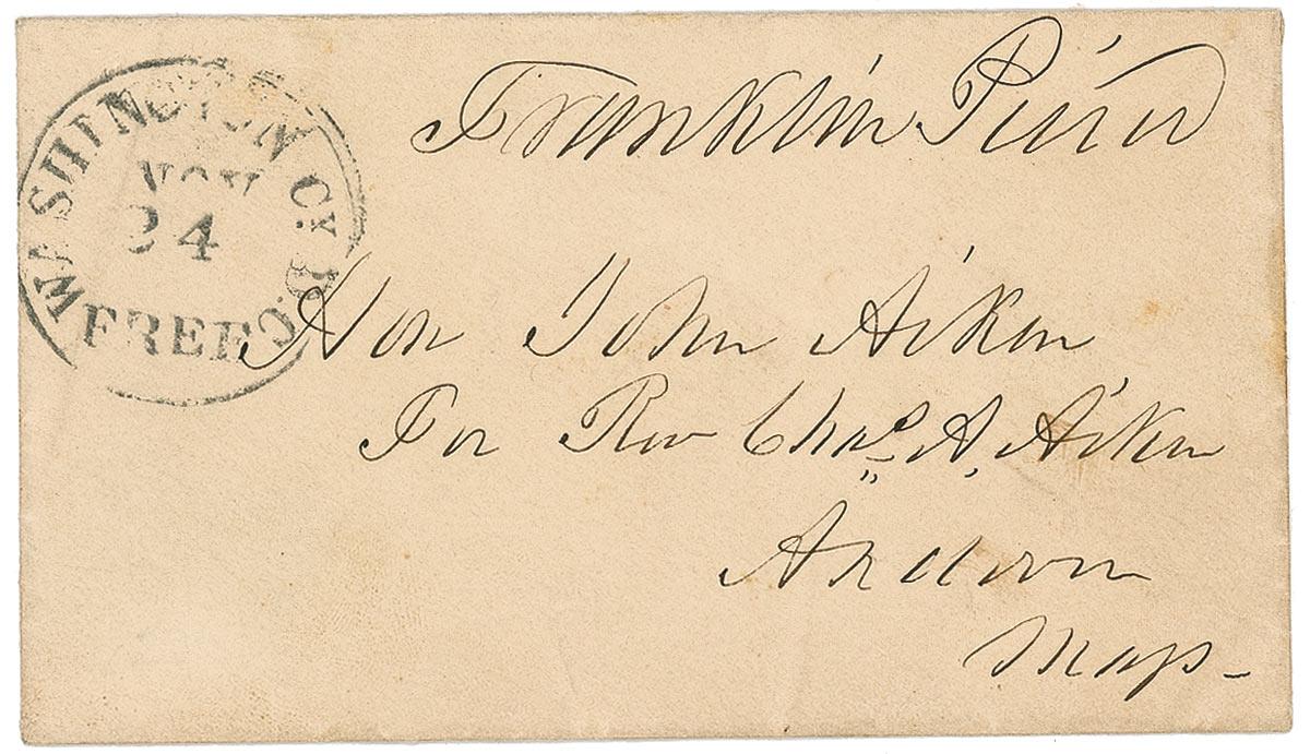 Hand-addressed and free franked envelope, 4.75 x 2.75, addressed in Pierce’s hand to “Hon. John Aiken, For Rev. Chas A. Aiken, Andover, Mass,” and franked in the upper right, “Franklin Pierce.” Envelope also bears a November 24, Washington “Free” postal cancellation stamp. In fine condition, with a few light creases, a couple trivial spots, and a mild shade of uniform toning.