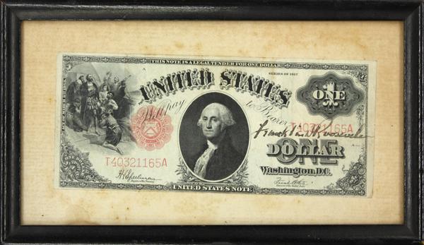 Franklin Roosevelt signed 1917 One Dollar bill, United Stated of America series of 1917 red seal one dollar bill, serial number T40321165A, framed 5.75''h x 9.75''w, Provenance: the consignors uncle was F.D.R.'s driver, when Roosevelt was Assistant Secretaries of the Navy