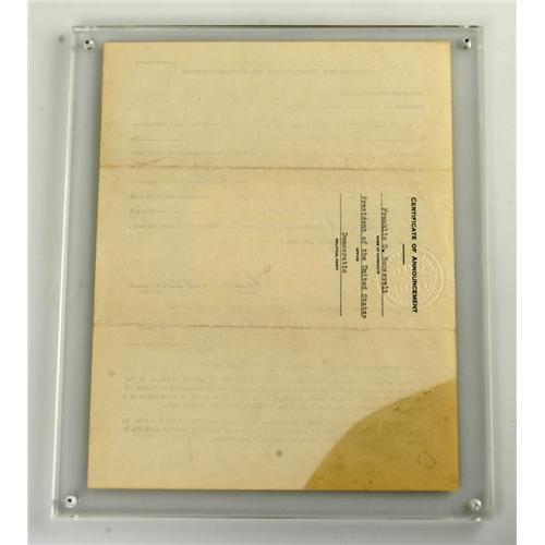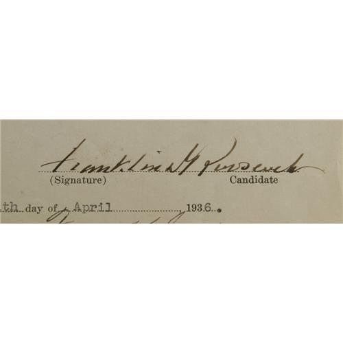 <B>Franklin Roosevelts Signed Official Declaration of Candidacy Form for his 1936 Presidential Re-election Run.</B></I> Notarized and dated April 11th, 1936, this is accomplished on a printed form entitled <I>"Candidates Certificate of Government / Election Form No. 1."</B></I> which was originally intended for use in declaring for the West Virginia Primary. However, this document is clearly not for that purpose. <I>"State of West Virginia"</B></I> has been crossed out in type at the top, and <I>"District of Columbia"</B></I> typed in its place. FDR certifies that he is a <I>"legally qualified voter"</B></I> who is <I>"eligible to hold the said office",</B></I> <I>"affiliated with said (Democratic Party), "</B></I> and <I>"a candidate for said office in good faith."</B></I> Where he fills in his address the state of residency was printed on the form as West Virginia, but again this has been crossed out and <I>"New York"</B></I> typed above. Clearly this unusual document was executed for some official purpose because it was notarized, but it seems quite odd that a West Virginian form would be used. Possibly, there was a deadline to fill, and this was the only form at hand. In any case, a unique and historic FDR relic, boldly signed in black fountain pen and in extra fine condition but for a minor light water stain at the lower left hand corner, 8.5"x11".