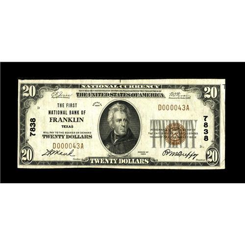 <B>Franklin, TX</B></I> - $20 1929 Ty. 1 <B>The First NB</B></I> Ch. # 7838<BR>A nice example which is one of the highest grade small notes known from here. <B>Very Fine.</B></I><BR><BR><b>Shipping:</b> Coin/Currency (<a target="_blank" href="http://www.heritageauctions.com/common/shipping.php">view shipping information</a>)
