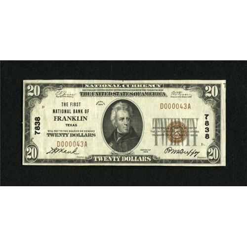 <B>Franklin, TX</B></I> - $20 1929 Ty. 1 <B>The First NB</B></I> Ch. # 7838<BR> Only one bank operated in this Robertson County town. <B>Very Fine</B></I>, with a bit of seal bleed.<BR><BR><b>Shipping:</b> Coins & Currency (<a target="_blank" href="http://www.heritageauctions.com/common/shipping.php">view shipping information</a>)