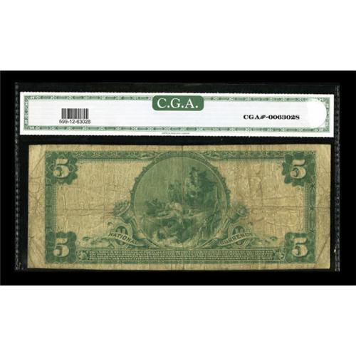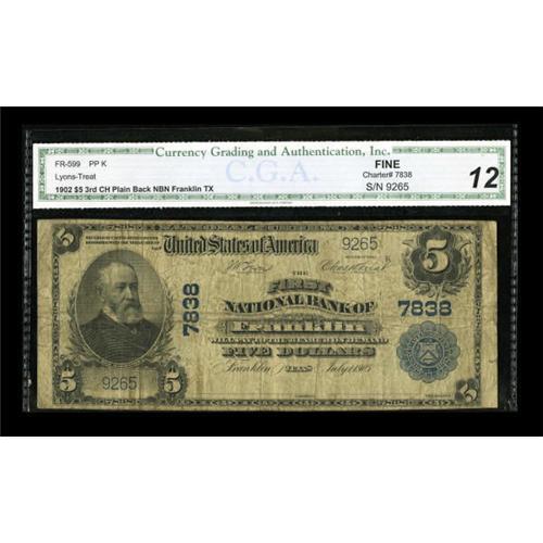 <B>Franklin, TX</B></I> - $5 1902 Plain Back Fr. 599 <B>The First NB</B></I> Ch. # 7838<BR> The paper is fully intact save for a couple of very minor edge splits. Only one bank operated in this Robertson County locale and appearances of large size survivors are far and few between. <B>CGA Fine 12.</B></I><BR><BR><b>Shipping:</b> Coins & Currency (<a target="_blank" href="http://www.heritageauctions.com/common/shipping.php">view shipping information</a>)