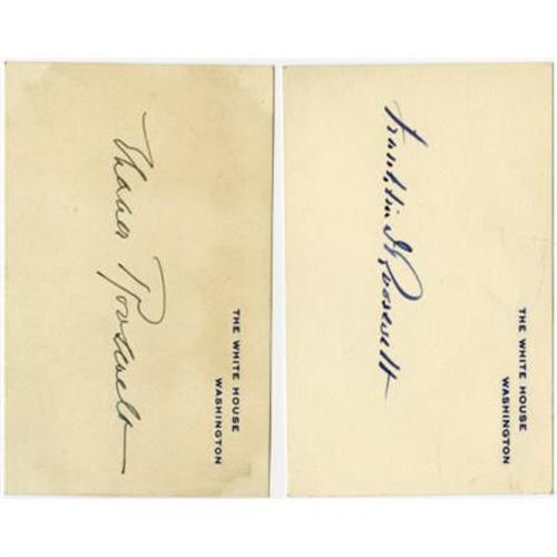 <B>Franklin D. Roosevelt and Eleanor Roosevelt Signed White House Cards.</B></I> Each card measures 4.25" x 3.75", Washington, D.C.. Accompanied by a letter from M. A. Leland, Private Secretary, dated November 14, 1939, and other ephemera from previous collector. Light fading on both cards.<BR><BR><BR><b>Shipping:</b> Flat Material, Small (<a target="_blank" href="http://www.heritageauctions.com/common/shipping.php">view shipping information</a>)