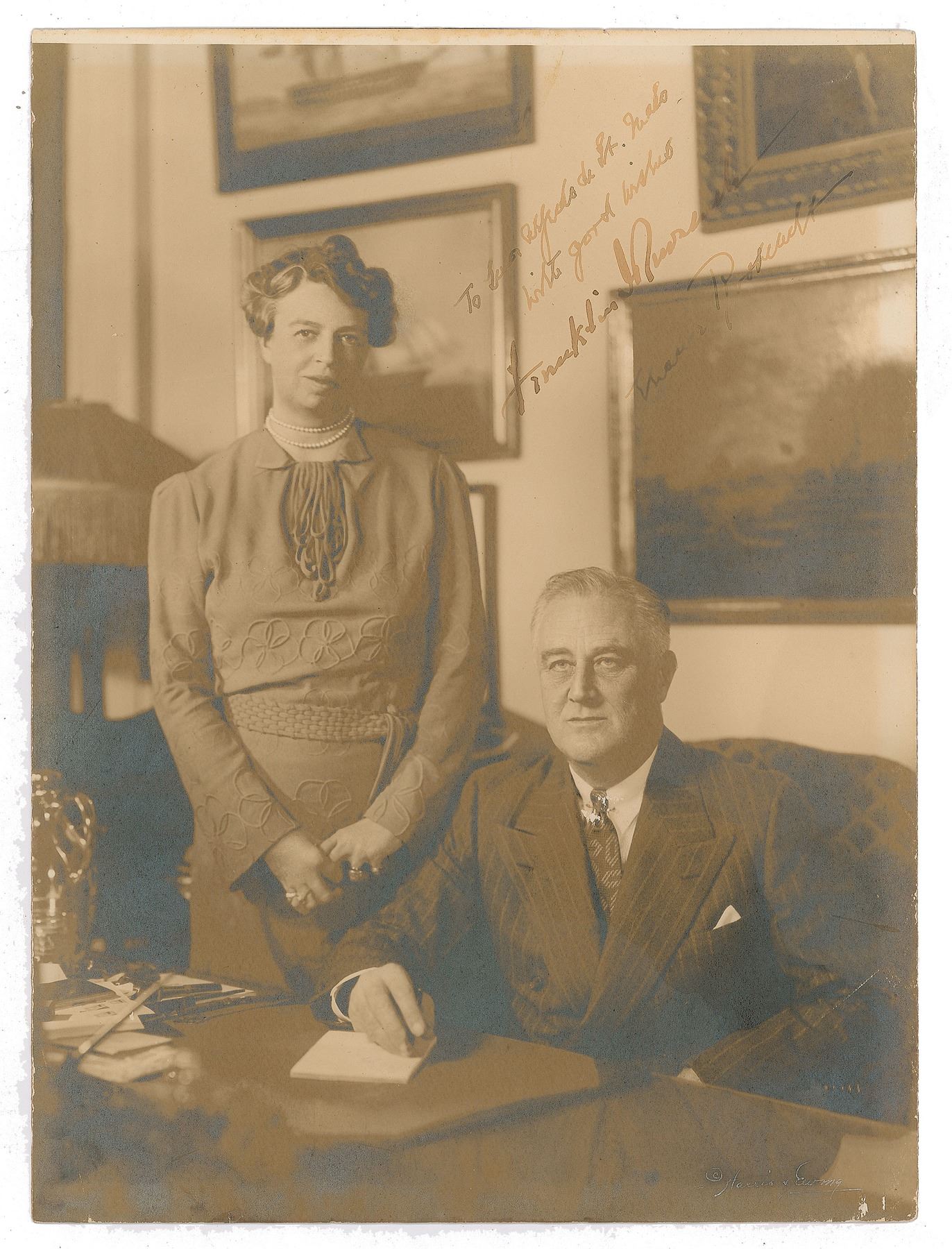 Vintage sepia matte-finish 9 x 12 Harris & Ewing photo, signed and inscribed in fountain pen to Panamanian violin virtuoso Alfredo De Saint Malo, "To Senor Alfredo de St. Malo, With good wishes, Eleanor Roosevelt" and "Franklin D. Roosevelt.” In very good condition, with trimmed edges, light silvering to the darker areas of the image, and overall warping, along with some shininess to FDR's jacket, apparently from onetime exposure to moisture. In 1939, Saint Malo was invited to Washington, DC, to present a private concert for the Roosevelts at the White House.