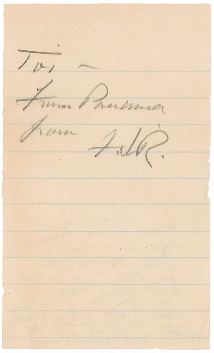 Two items: a pencil signature and inscription, “F. D. R.,” on an off-white 3 x 5 lightly-lined page; and a TLS, one page, 6 x 5, Val-Kill Cottage letterhead, June 25, 1946. Brief note to Mr. G. D. Norris. In full: “I do not think a World Government can be achieved for sometime.” In overall fine condition. Accompanied by the original mailing envelope for the letter.