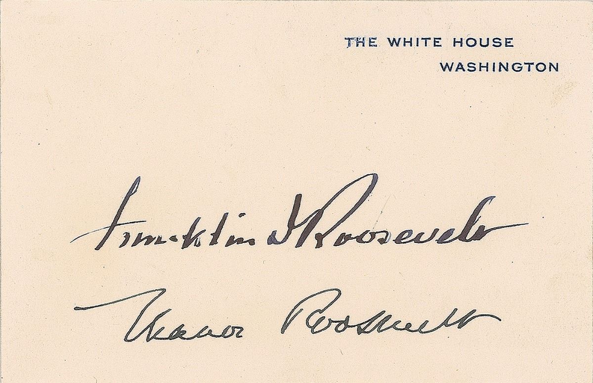 Scarce White House card signed in black ink by Franklin and Eleanor Roosevelt. In fine condition. This is the first double-signed Franklin–Eleanor White House card we’ve offered.