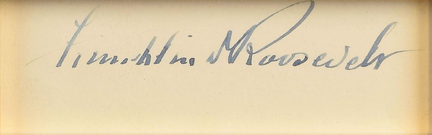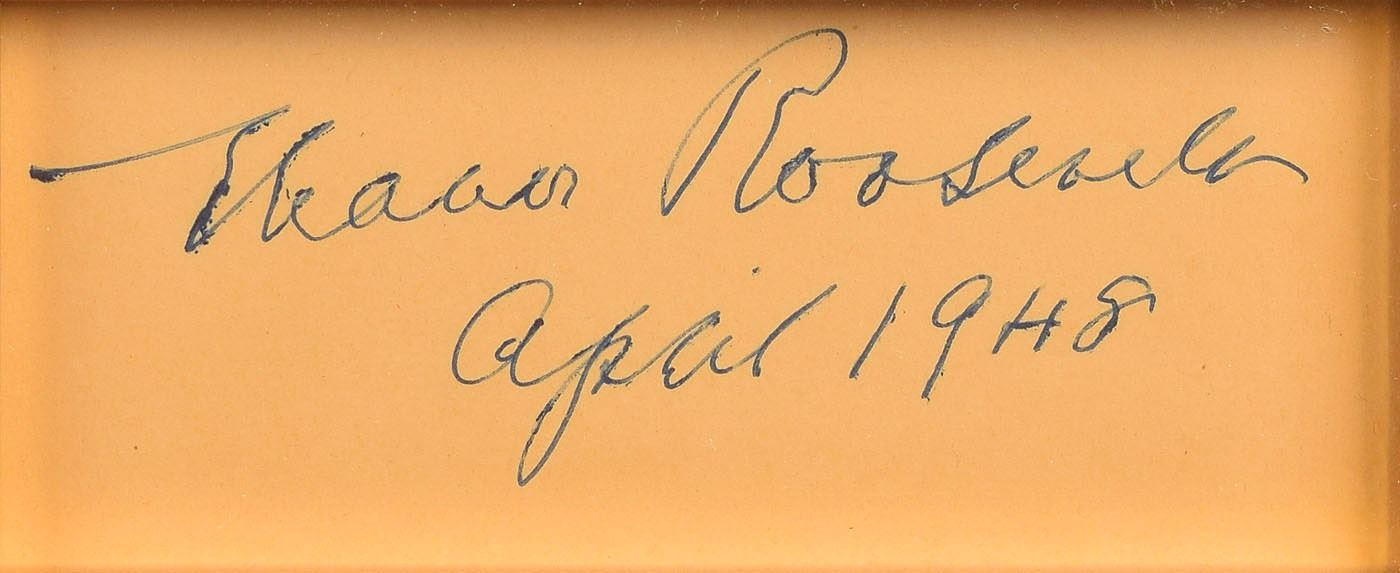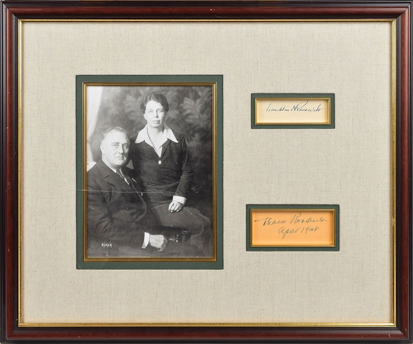 Desirable pairing of a fountain pen signature, "Franklin D. Roosevelt," and a ballpoint signature, "Eleanor Roosevelt, April 1948," on individual slips, handsomely double-cloth matted and framed with a portrait to an overall size of 22.5 x 19. In fine condition, with scratching to the plexiglass.