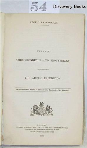 (Franklin search) ARCTIC EXPEDITION. FURTHER CORRESPONDENCE AND PROCEEDINGS CONNECTED WITH THE ARCTIC EXPEDITION ...... London: Eyre & Spottiswoode 1852 Lg. 4to. 216pp. Nine illus, 4 maps incl. 1 folding. Contemporary limp leather, plainly rebacked. Chipped & worn along edge, but a clean, tight copy.