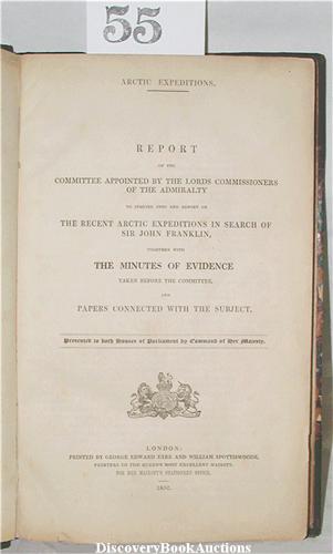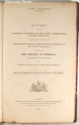 Franklin search) ARCTIC EXPEDITIONS. REPORT OF THE COMMITTEE APPOINTED BY THE LORDS COMMISSIONERS OF THE ADMIRALTY TO INQUIRE AND REPORT ON THE RECENT ARCTIC EXPEDITIONS IN SEARCH OF SIR JOHN FRANKLIN ...... London: Eyre & Spottiswoode 1852 Lg. 4to. lix,199pp. Two illus, 2 folding maps. Bound in old half morocco & marbled boards, rebacked. Very good, sm. With the bookplate of the Stefansson Collection at Dartmouth College.